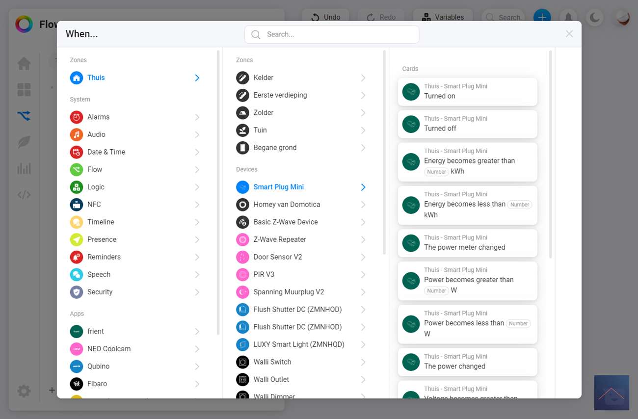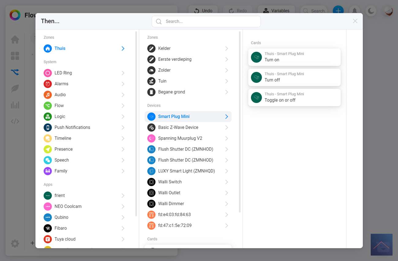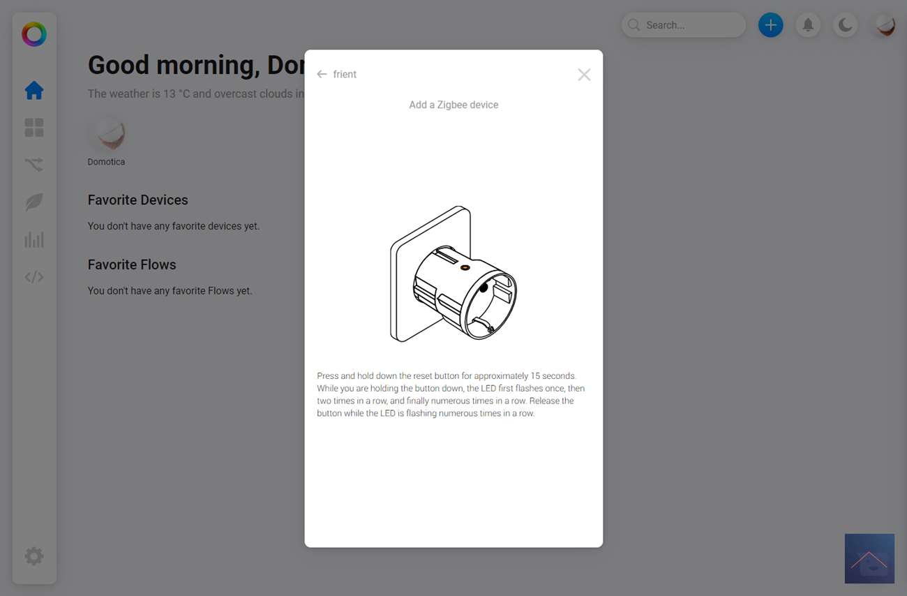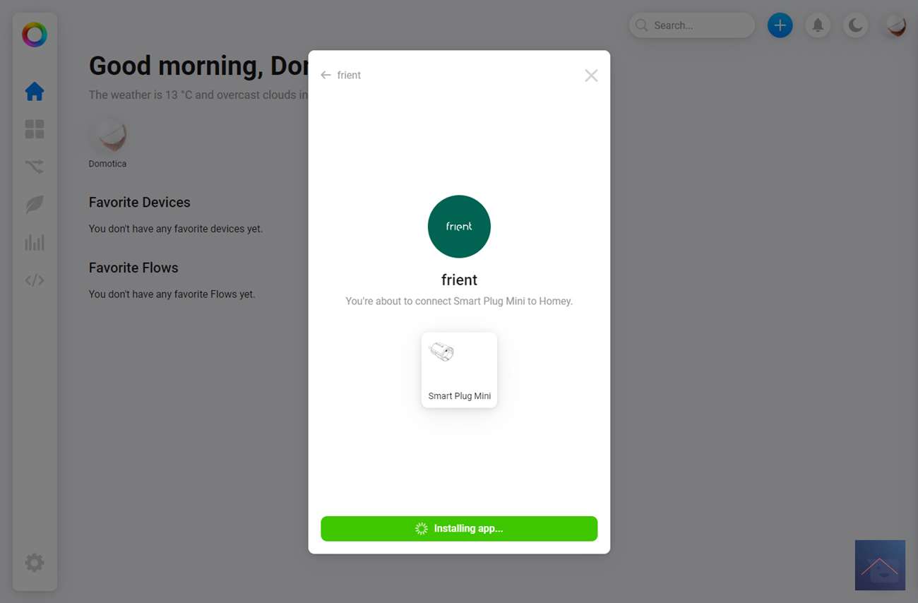 Then we click on the plus sign at the top right and click on "new device". After this we search for Friend and select the Smart Mini Plug. After installing the APP, you will be asked to press and hold the button on the top for 15 seconds. The LED will flash 1x red then 2x red and will then flash several times in succession. Now is the time to release the button. I see that the Homey finds it and it is added.