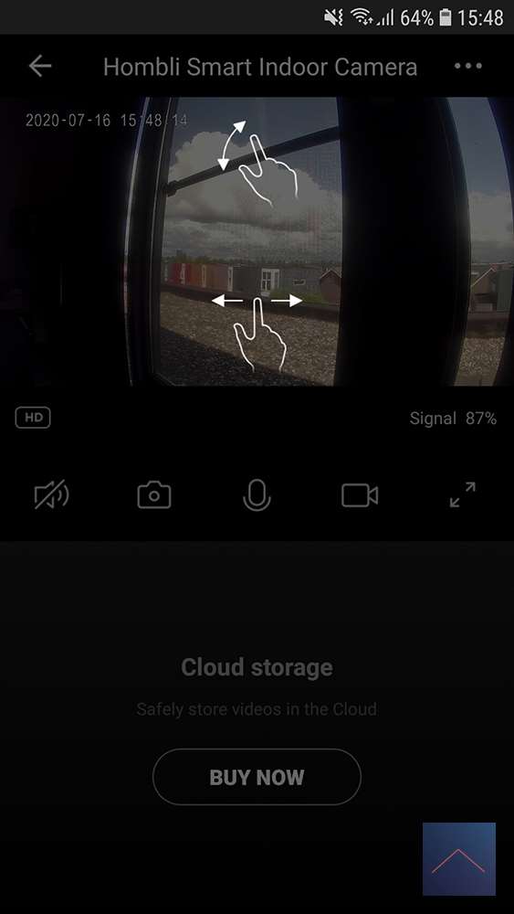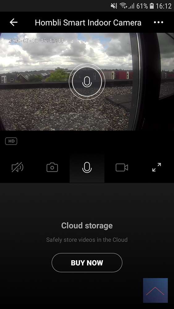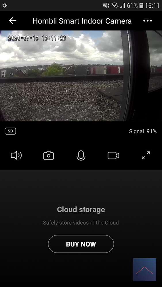 We go through all the possibilities of the camera. In the main screen of the APP we click on the device name “Hombli Smart Indoor Camera”. The camera has to charge as fast for a second and we have an image, the image also shows the date and time. Immediately left below the image is HD and when we click on it, it changes to SD. On the right, directly below the image, we see the strength of the WiFi signal.