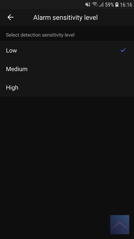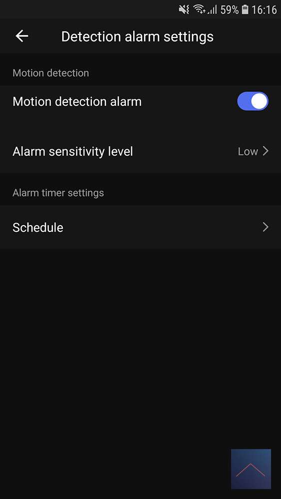 With Detection alarm settings you can switch motion detection on and off, Alarm sensitivity level can be set to Low, Mdeium and High. Finally, you can create a schedule under schedule when motion detection should be on and off. Personally, I miss the choice to only perform motion detection on a part of your image, so you can determine more accurately if something moves in a certain place.