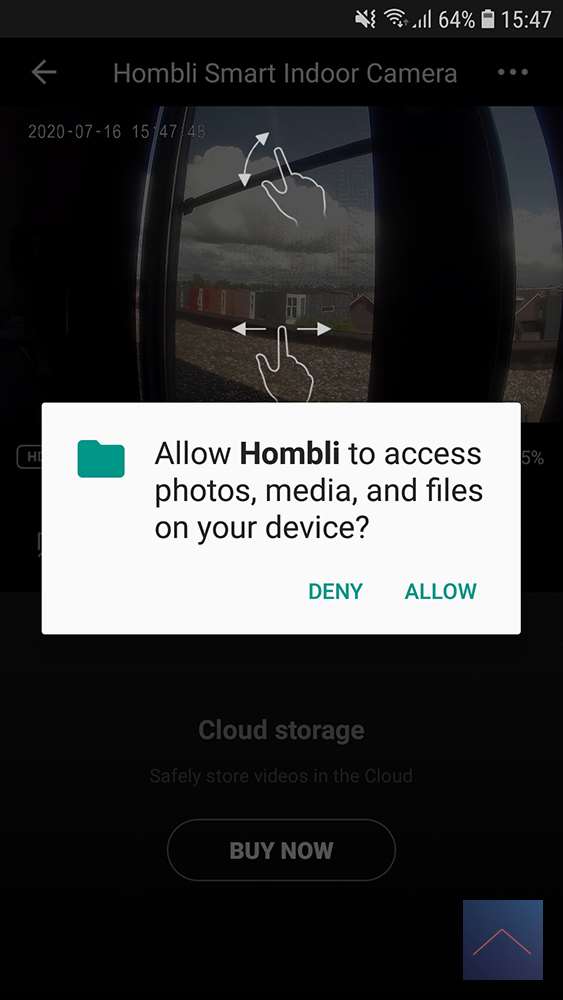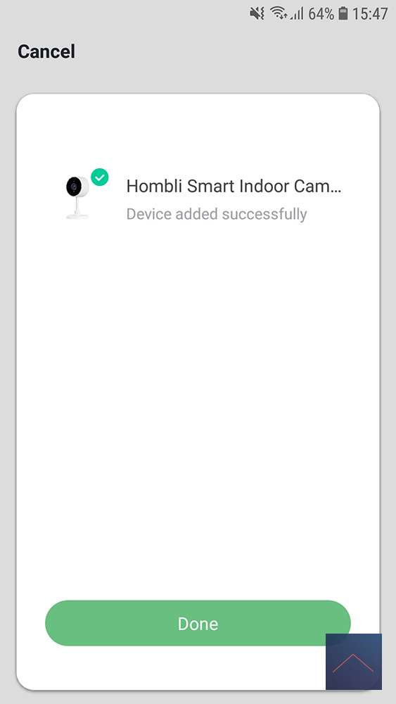 After confirmation, the App will search for the camera and find it immediately and indicate that it has successfully added the camera. This all works flawlessly. If we click on Done, you must first give permission for the Hombli App to access your photos, media and files on your mobile, after approval you will immediately go to the main screen of the indoor camera, I go back to the main screen and there is the smart indoor camera with a beautiful photo icon of the product. There are no buttons to quickly perform an action.