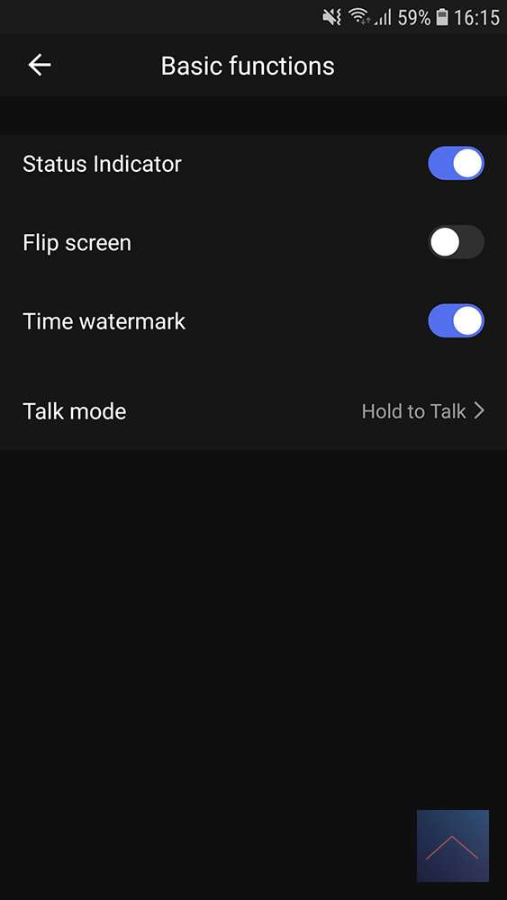 I cannot find out what the Status indicator does exactly, Flip screen rotates your image 180 degrees and Time watermark displays date and time. With Talk mode you have the choice to hold the button or give a click to turn on and a click to turn off.