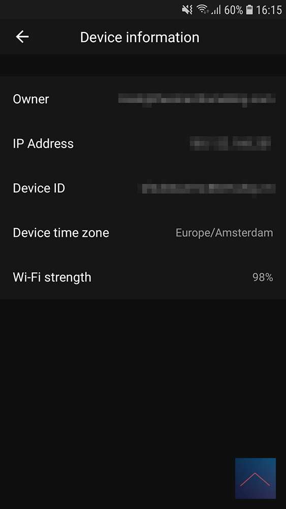 Device information contains the E-mail address of the owner, network names, time zone and wifi strength.