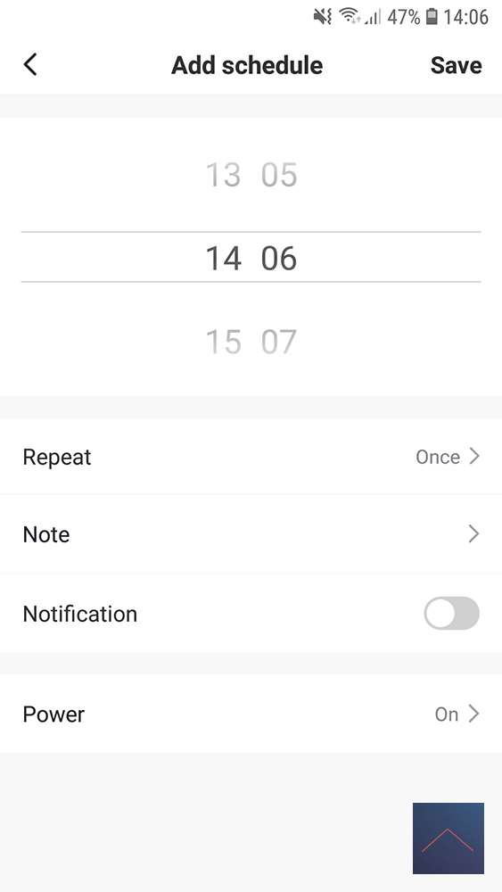 In the Schedule tab we can create different time schedules. You select the time and at Repeat you can choose once (Once) or which days of the week. At Note you can put a note or name and you can switch the notification on or off below. Now you only have to determine at “Power” whether the power should go on or off. You save it and this schedule will then appear in the list, not under a name but at the time. The nice thing about this schedule is that you put this on the Smart Socket itself and not in the cloud, so if your internet connection is lost, the schedule will continue to work.
