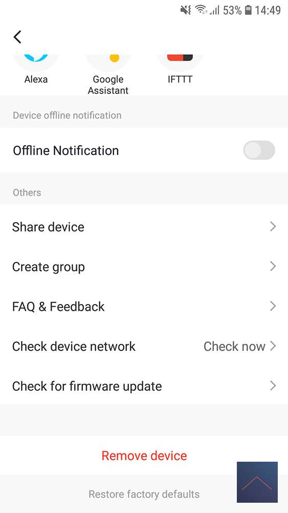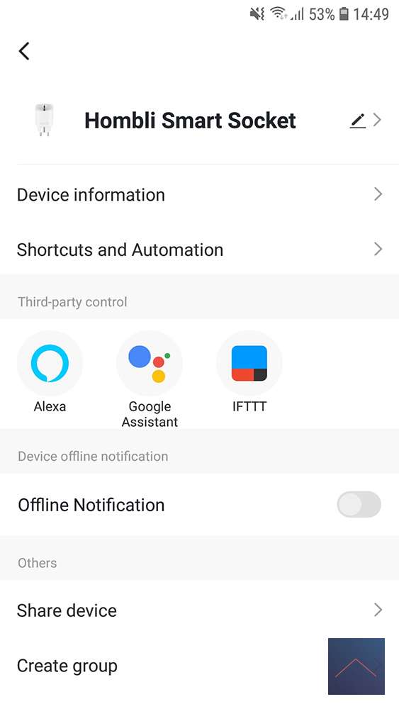 Below that, Offline Notification is a good option to receive a message when the Hombli APP can no longer find the socket.