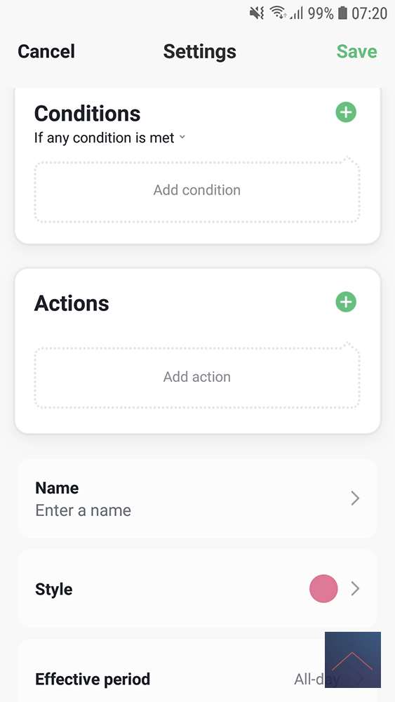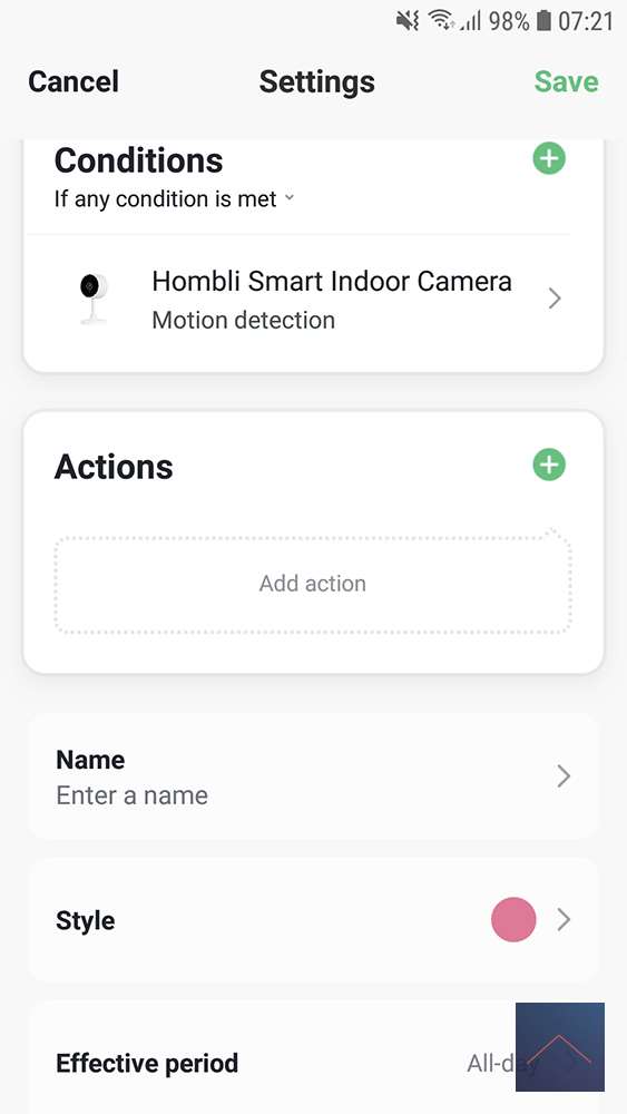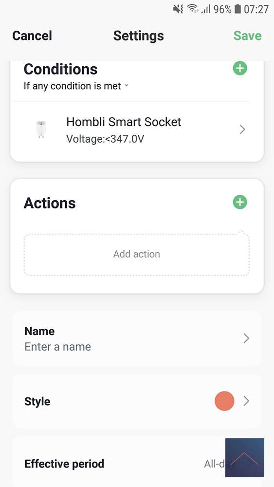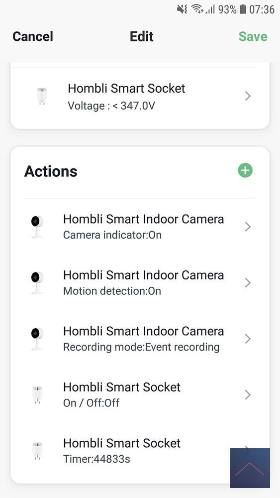 Good job so we make another automatic with the +. We set the condition that if the smart socket exceeds 110 Volt, we want the indicator light of the camera and motion detect to be on. We also want the camera to record this event. We give this a name in style, we give a color and photo and save this by Save.