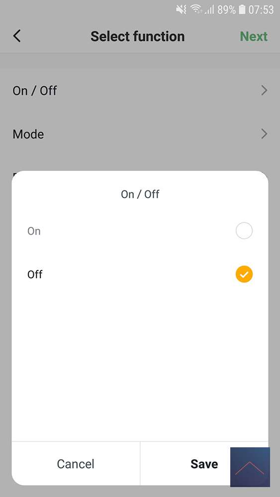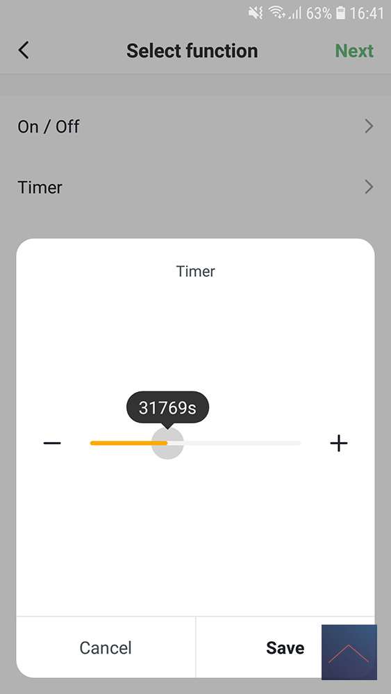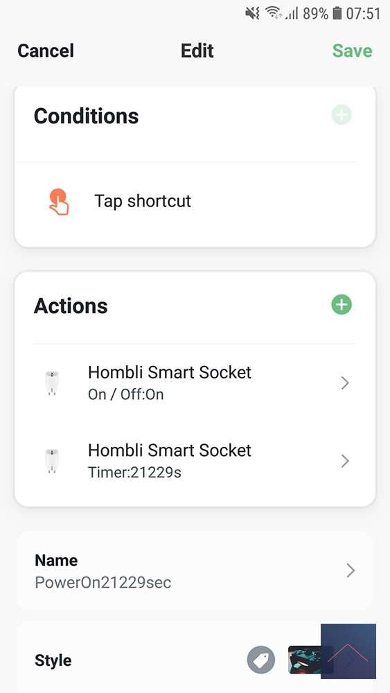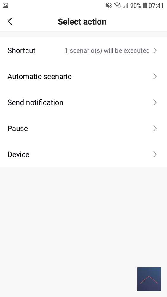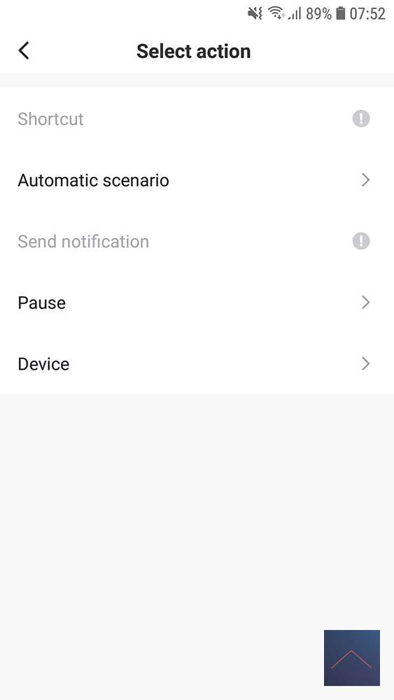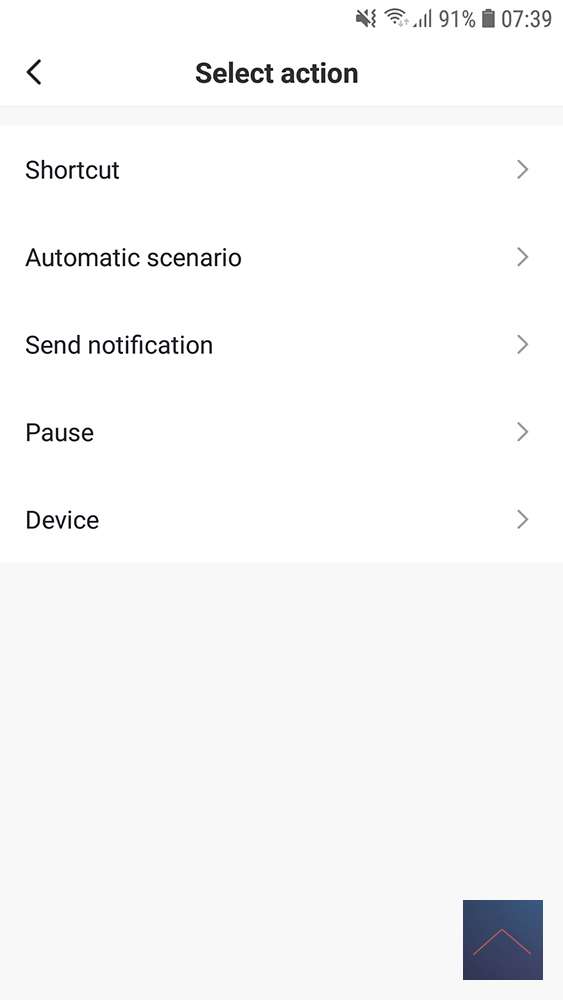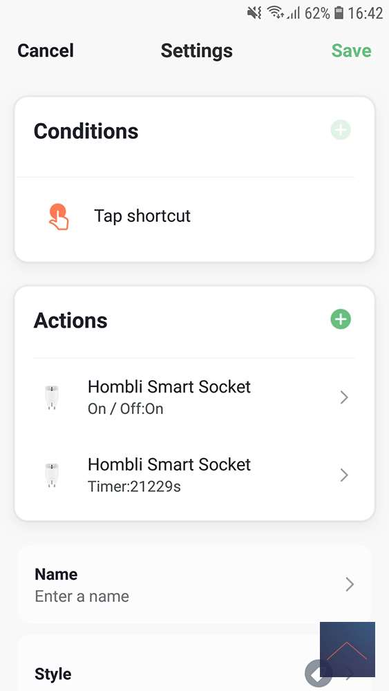 You can add 1 or more actions to actions. You click on add action or the + and then you have the choice between; Automatic scenario, Pause and Device. In this example we select Device and then the Hombli Smart Socket. We then get two options on or off and Timer, we select on and set the timer to x number of seconds.