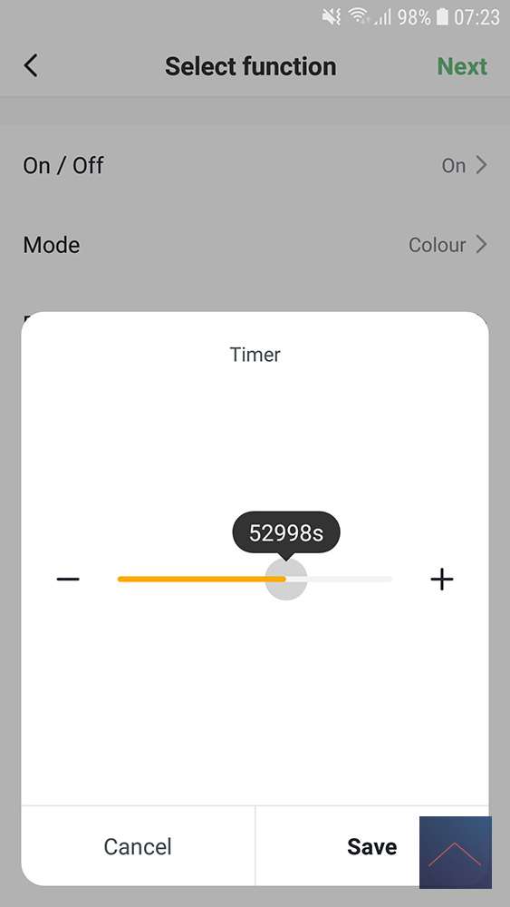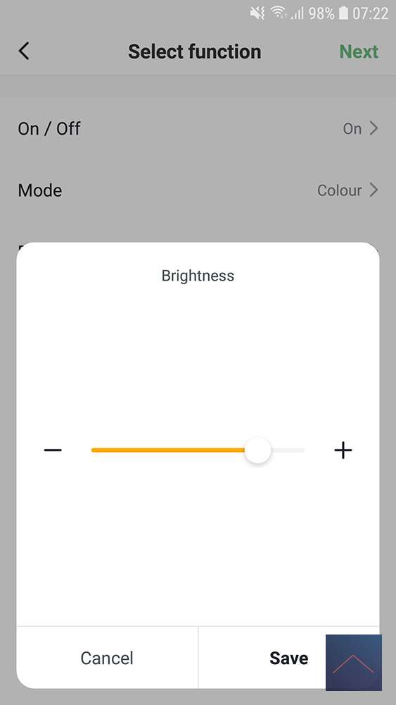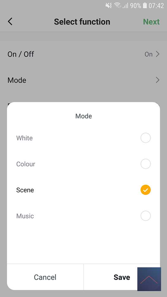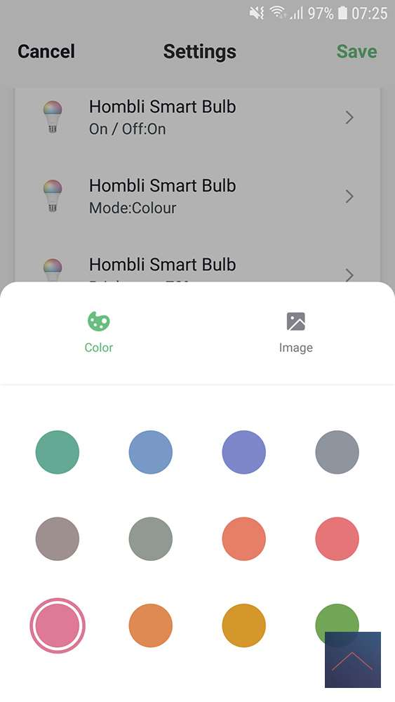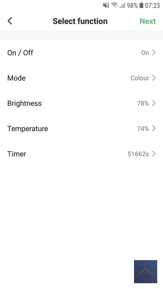 Nu gaan we een Automatic Scenario aanmaken in de tab Automatic. We komen in het zelfde scherm als bij shortcut, maar bij Condition kunnen we nu alles kiezen behalve shortcut. We selecteren de camera bij Device en zetten de conditie Motion detection. Nu willen we als de camera een beweging detecteert dat de lamp aangaat rood gaat branden. Dus bij Action selecteren we de bulb onder Device met de optie om aan te zetten en de mode wordt dus Colour. Alleen ik kan nu niet een specifieke kleur kiezen…. Goed ik selecteer de brightness, temperature en de Timer op een random aantal seconden.