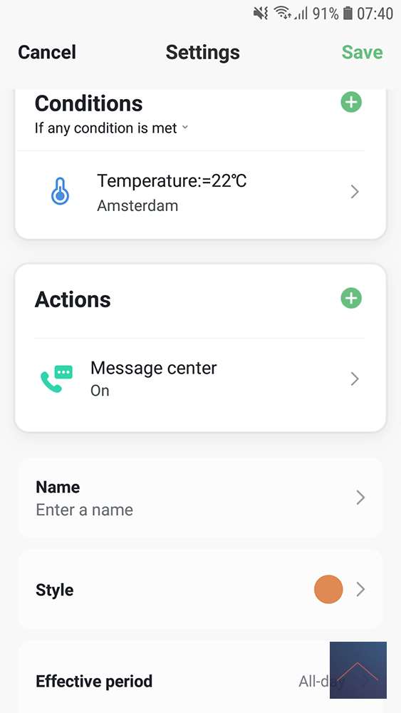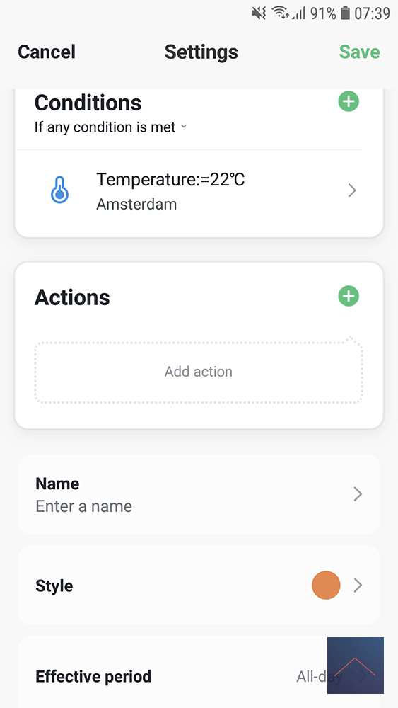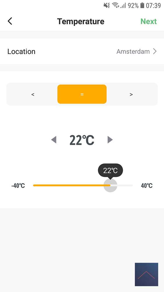 Ok we make 1 more to see if we can make nice combinations. As a Condition we want the action to be carried out when it is 22 degrees in Amsterdam. First of all, the Hombli APP wants to access your location, if you don't give it, it won't work. Well, we give access and then adjust the location to Amsterdam.