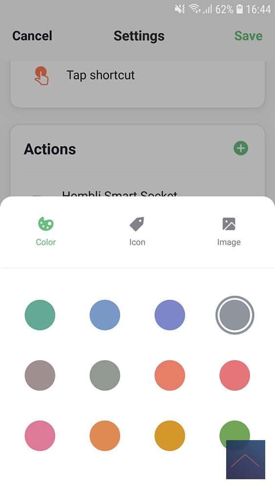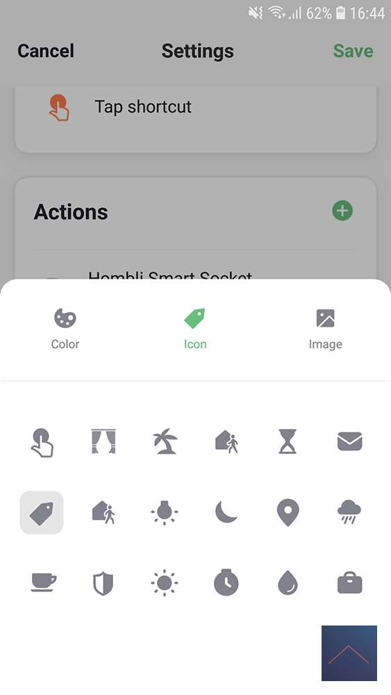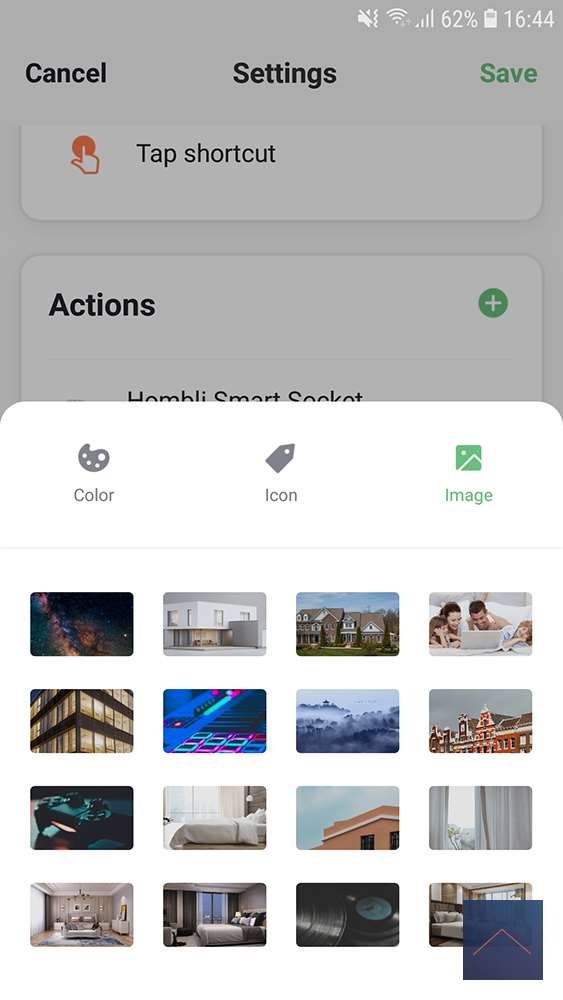 The last option is to also put the shortcut on the main screen of the Hombli App. We turn this on and click Save at the top right. The shortcut has been created and is ready to be used on the shortcuts tab and on the main screen. Where did the photo go that I chose?