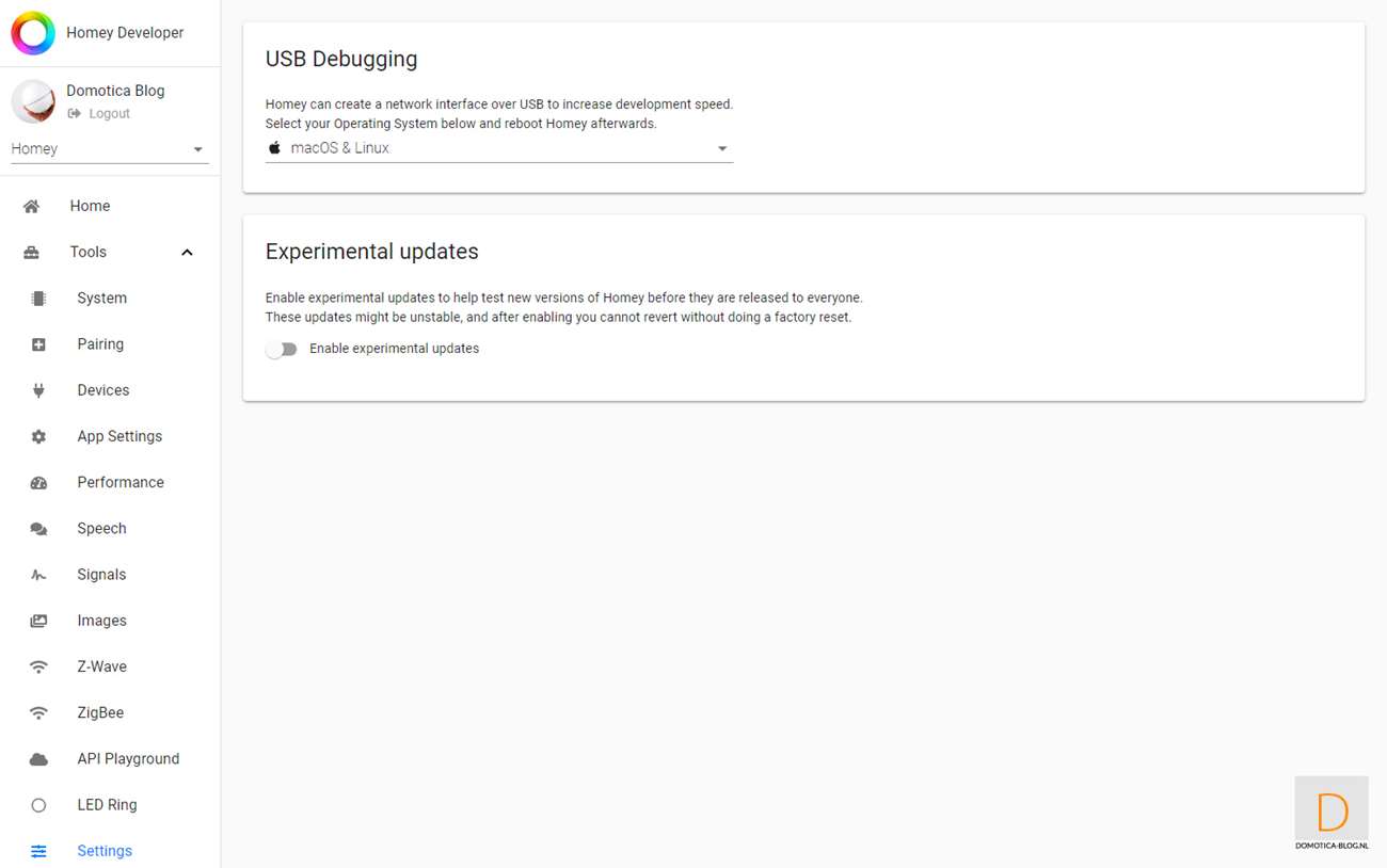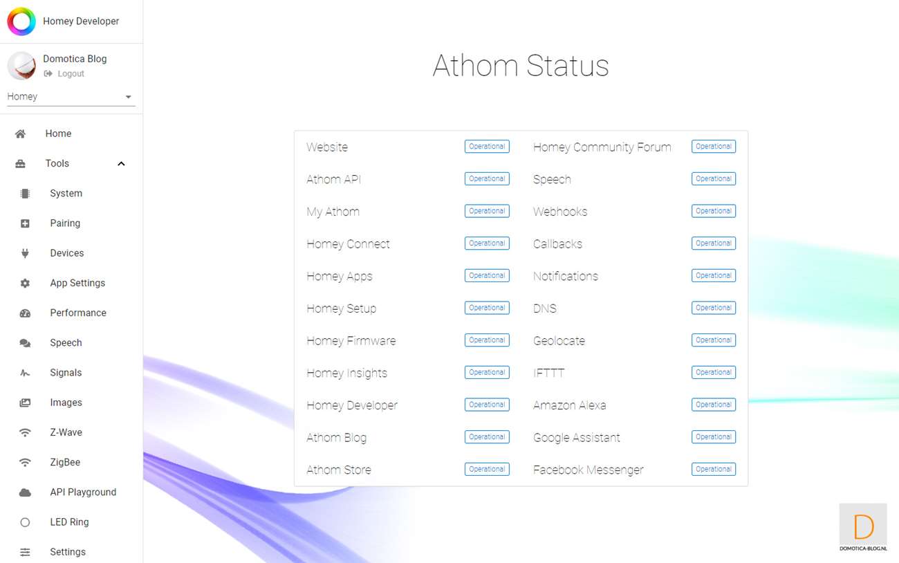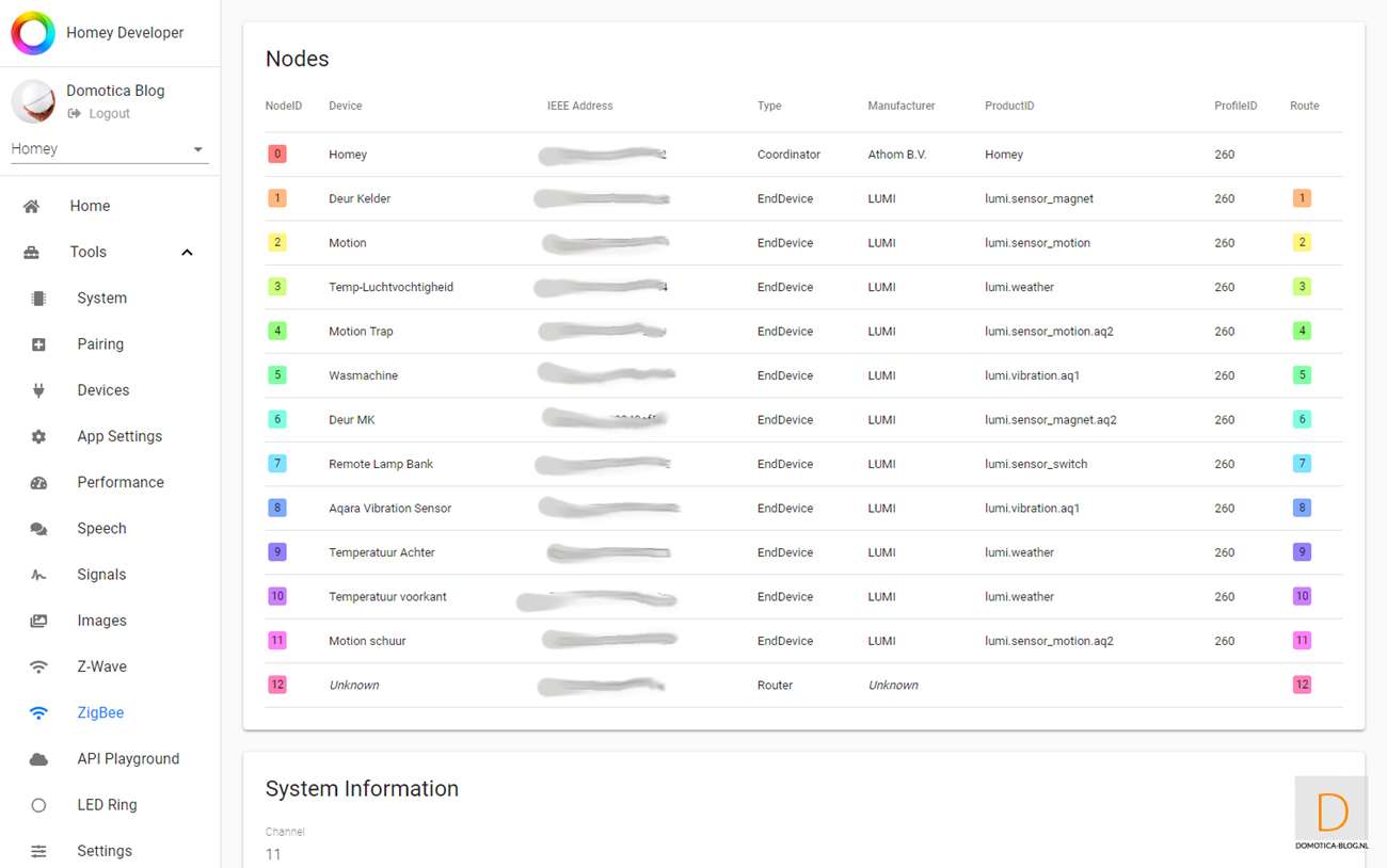 In addition to the APP, there is also a web part of the Homey. Athom calls this the developers part. Here you can restart the homey, view the performance and view system data. You will also find all the devices here (Z-Wave, BT, Zigbee and 433Mzh) and you can get a comprehensive overview of your network. This way you can see what your network connection is between the different devices. You can also find your network heal here to rebuild your network. Very useful feature to ensure that everything continues to work properly.