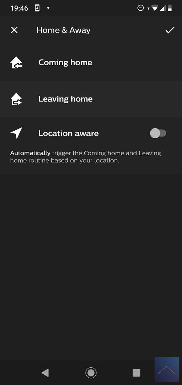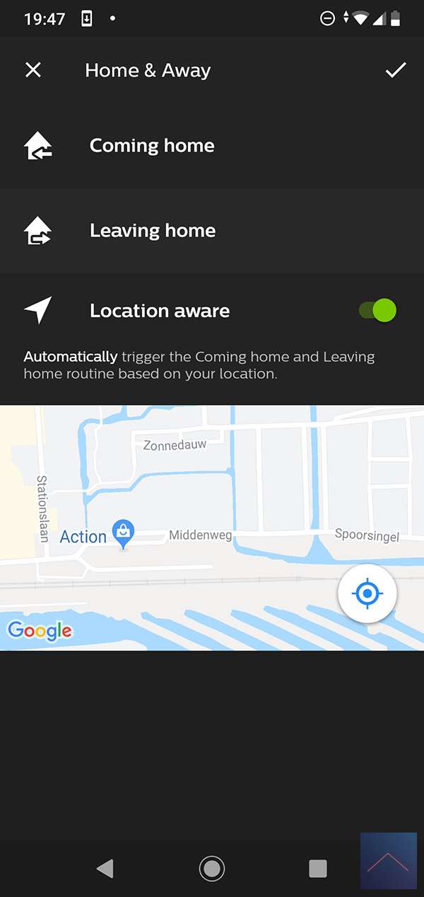 The first step is to enable "Location aware". If you create a home and away routine, this will be automatically prompted. Then I say that when I'm gone the plug should be turned off. And then we make 1 more which turns the plug back on.