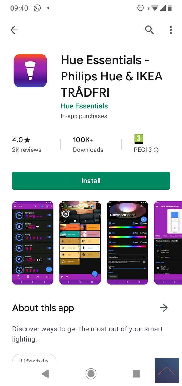 3) Then install the HUE Essentials APP and make sure it is connected to the bridge (this is explained in the APP).