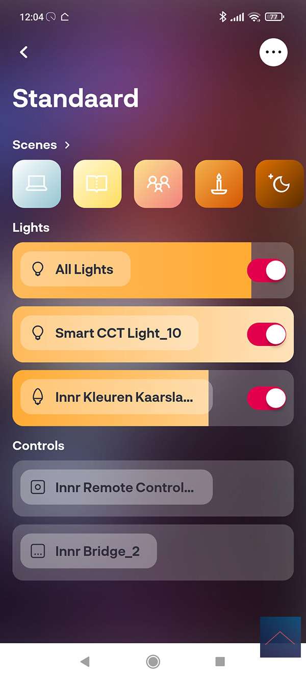 To add the lamps, we start the INNR APP and press the plus sign at the top right and press add devices. Now we scan the QR code on the side of the lamp. Now we supply the lamp with power, it will then flash for a while. After a few seconds the lamp is found and we see a short blink to confirm that the lamp has been found and I see it appear in the APP. We can dim it, change the color of the RGB LEDs and adjust the white LEDs. So exactly as it should be.