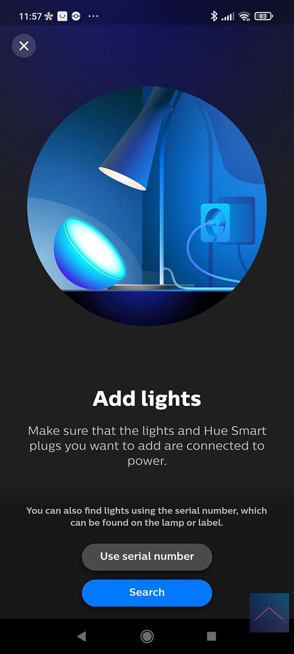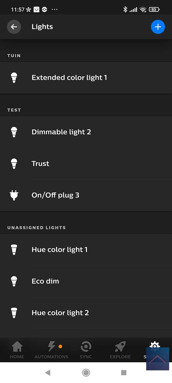 We first log in to the Philips HUE APP and go to the settings (radar at the bottom). We then press "lamps" and then the plus icon at the top right. We are not going to add a Philips product so we will use the search function. Now we power the INNR lamp which will display different colors. After a few seconds I see a blink and the lamp is found in the APP.