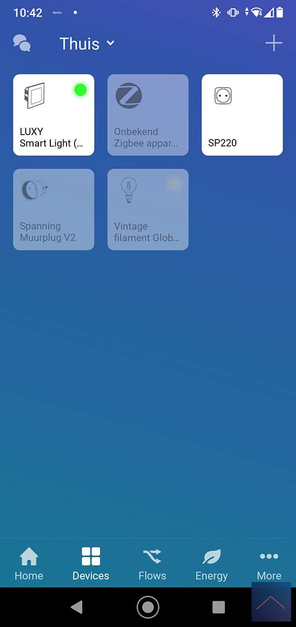 We log in to the Homey first and go to my devices. We then press the plus sign and find the SP-220. Now we supply it with power and keep the button on the front pressed for 5 seconds. The LED on the top will now flash red and then green to indicate it has been added. This is also the case because I see in the Homey that it has been found.