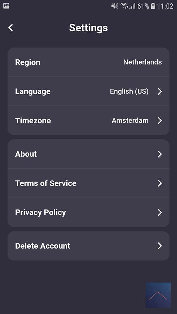 Under the settings option you can set your region, language and time zone. At About you can find the app version and if you want you can read at Terms of Service and Privacy Policy what data they store and what they do with it. Finally, you can delete your account at Delete Account, you do need your password for this.