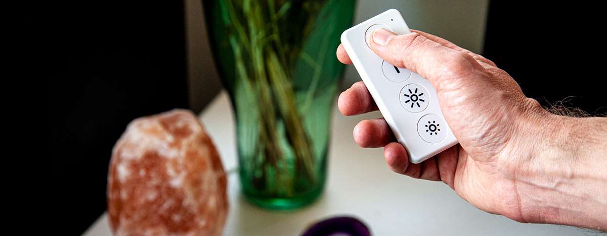 This set is equipped with a remote control with which you can turn your lights on/off remotely. This remote control will not hit you that quickly because the buttons are mega large. It reminds me a bit of an elderly telephone. It is equipped with 4 buttons; on/off and 2 dimming buttons (brighter, less bright).