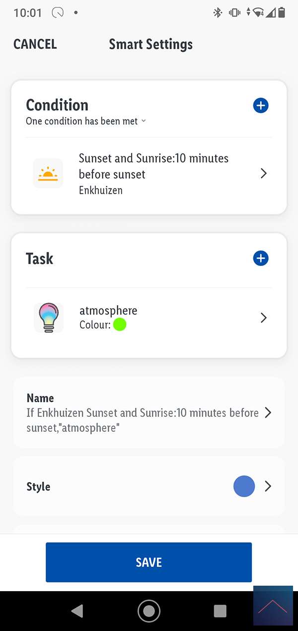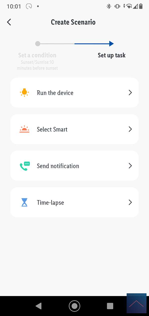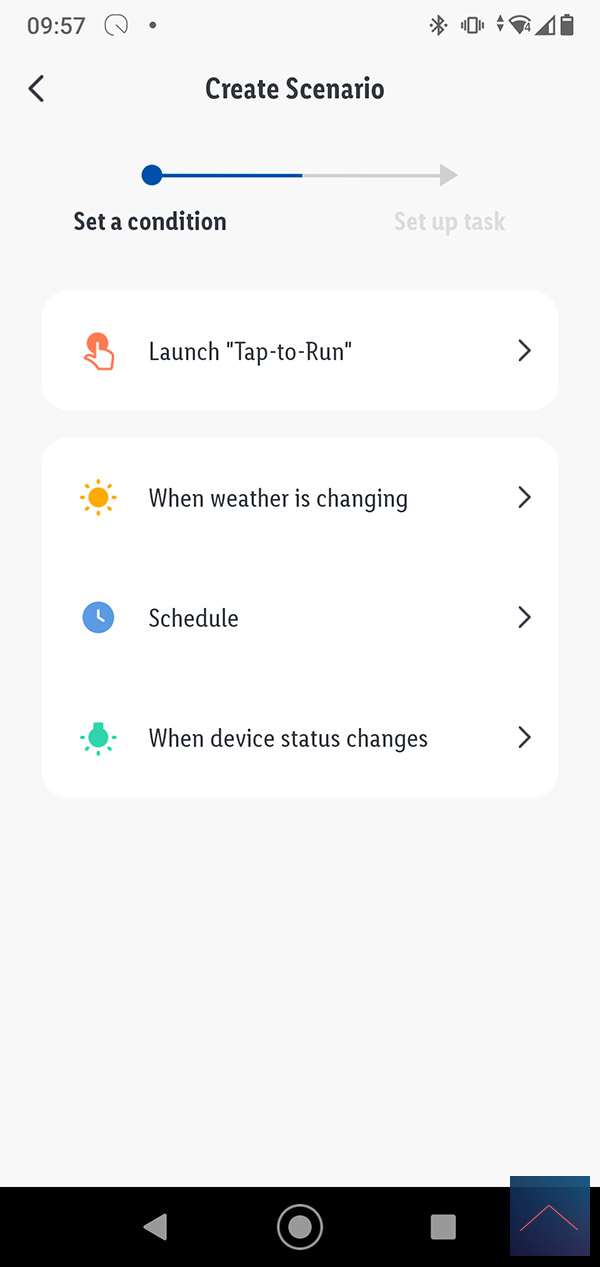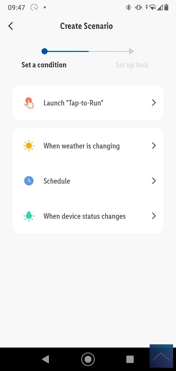To create a smart scene, click on the plus sign in the top corner. The first step is to set the condition (trigger). This consists of 4 parts. A "Launch Tap To Run" gives you a button to start the scene. This can be useful to create an atmosphere in your living room, for example. You can also start another scene with this option