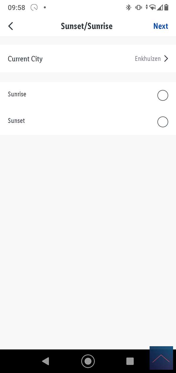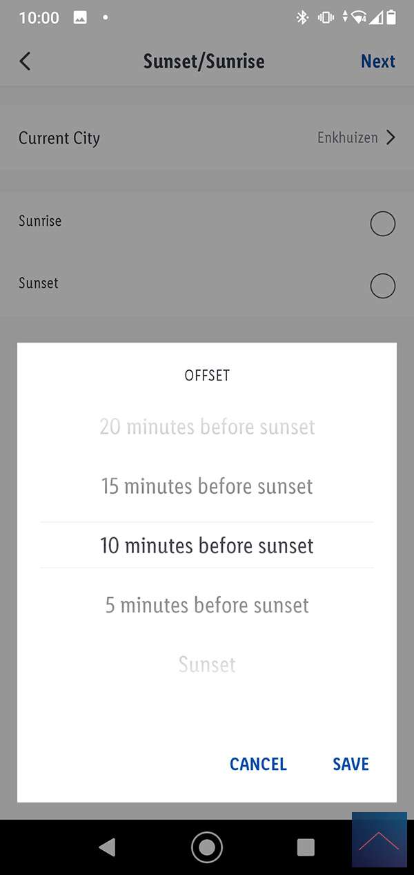 Let's create a scene where, when the sun goes down, the lamp is turned on to a yellow color. We press the plus sign and select "When weather is changing" and click on sunset/sunrise. Now we select sunset and get the option to set an "offset". With this we can say, for example, that we want to start the scene 10 minutes before sunset. This is a nice option so we choose this.