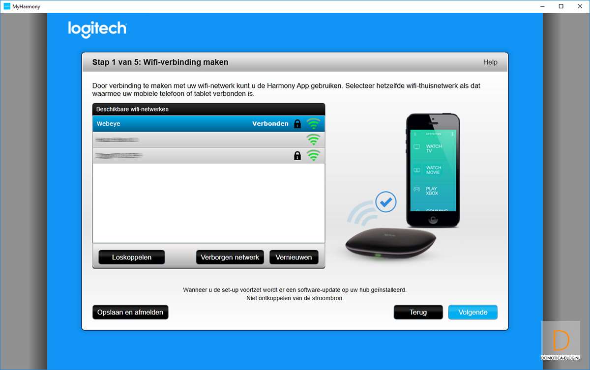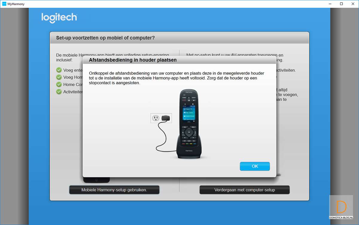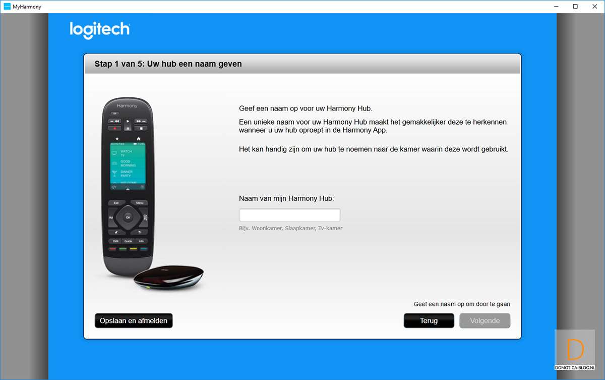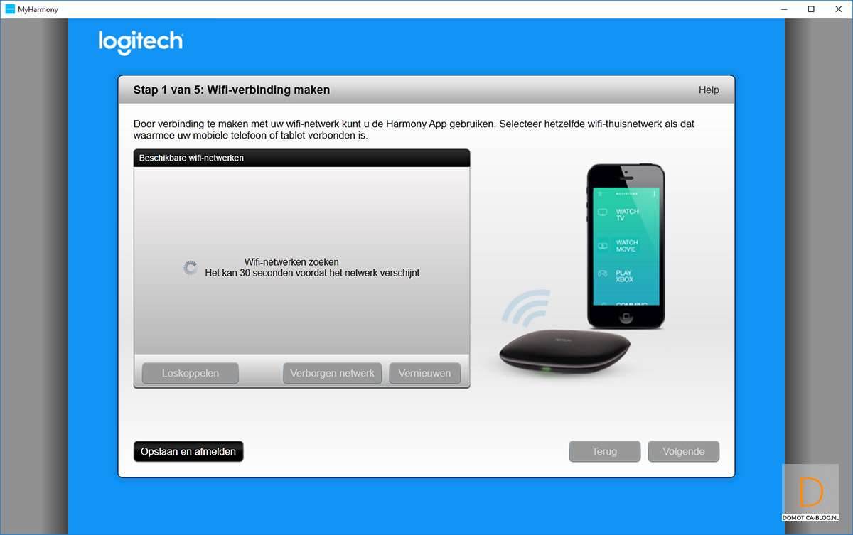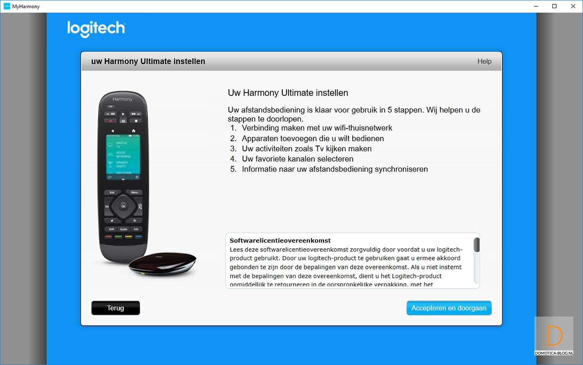 The first step is to download the software. You can find this on the Logitech website. Make sure the remote control is connected to your computer with the supplied cable. When you have started the software, you first create an account. It is best to create your own account (not facebook / google) if you want to link it to the Google Home, this works best. Then connect the remote control to your local WiFi.