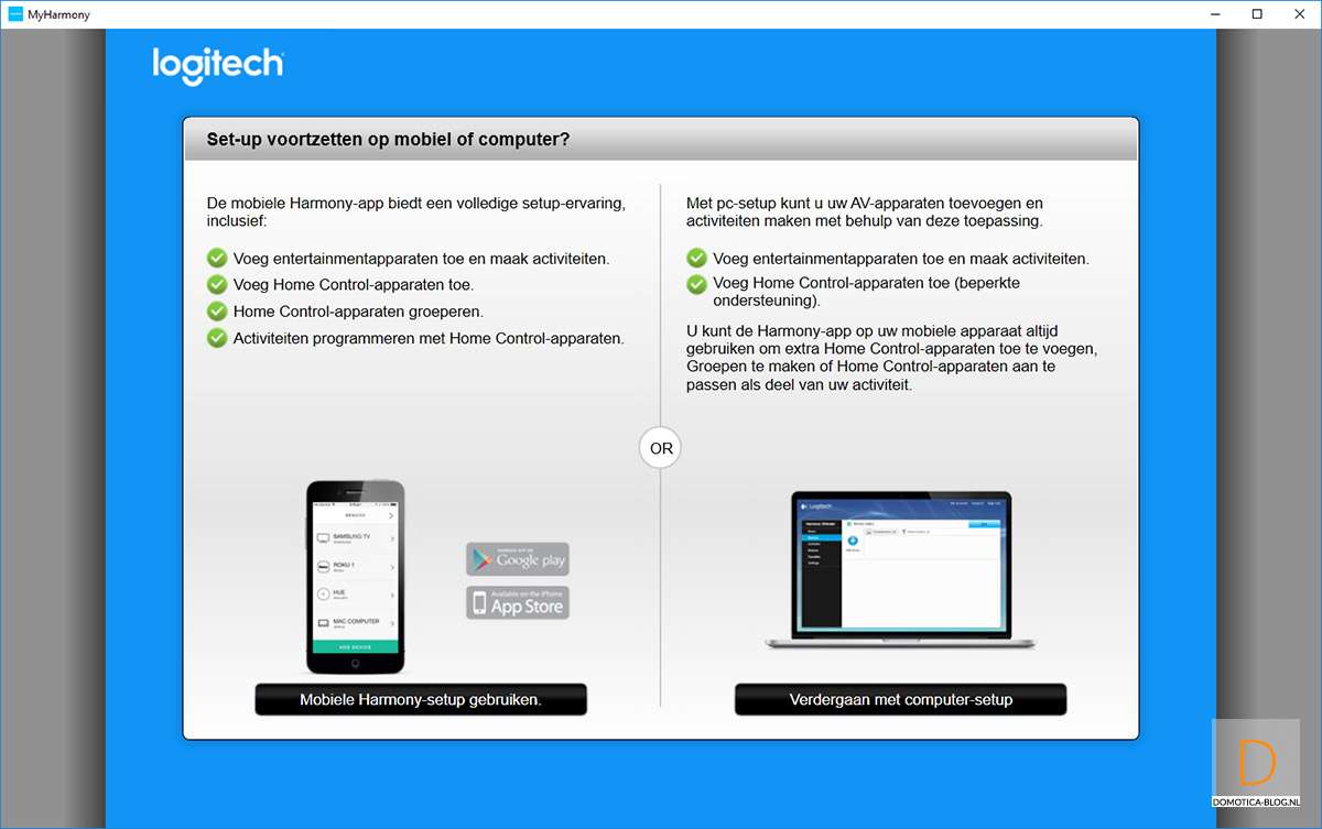 You can control 2 different types of devices with the Harmony. One is the infrared devices such as your TV, amplifier, etc and the other are so-called IP devices such as Philips HUE and Nest products. We start with the infrared devices.