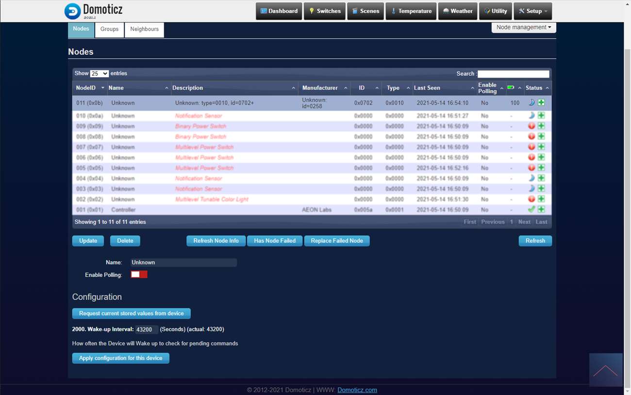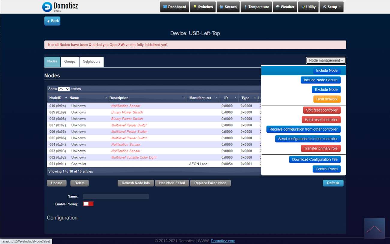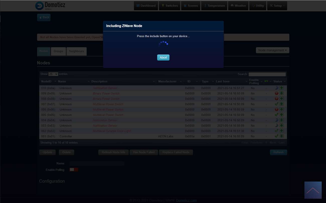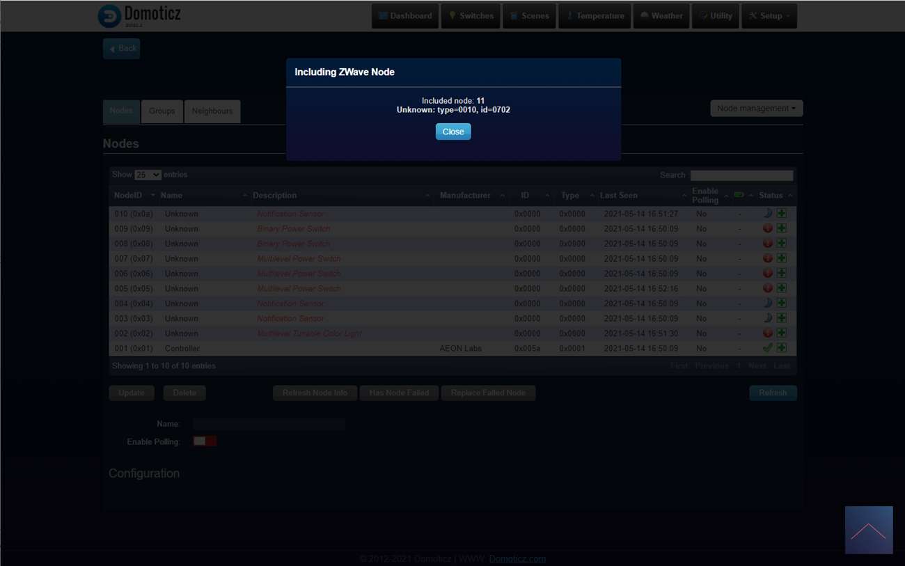 The first step is to remove the cap from the sensor and remove the tab near the battery. Now we can log in via the Domoticz web interface. We go to the menu item "setup" and to "hardware". Then press the setup at the Aeon Labs controller and press "include node secure". There will be a pop-up that the controller is in learning mode. Now press and hold the add button for 5 seconds until the LED lights up white. When we release it, I see the LED flashing blue indicating that it has been added, this is also the case because I see a message in Domoticz that it was successful.