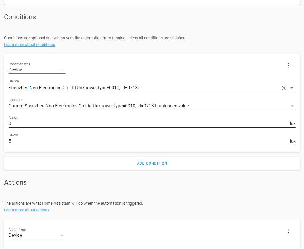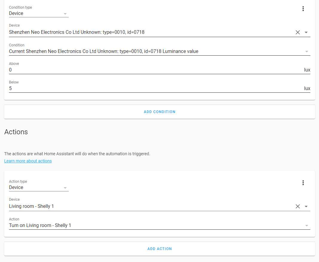 We create a scene where if movement is detected and the lux value is lower than 5, the lamp in the hall is switched on.