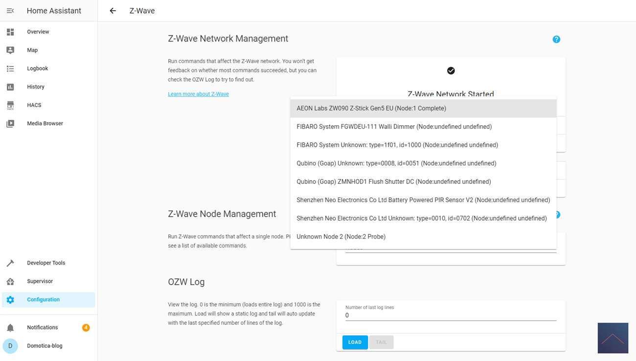 The last controller is HASS's turn. This is a free software package that you can install on different hardware. We have it running on an RPI-3 with an Aeon Labs Z-Wave USB stick to add it to. You can start adding it by going to the configuration and then clicking on Z-Wave. Then click on "add node secure" to start adding. HASS gives a very short message that the adding has started.
