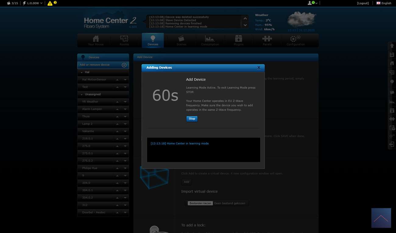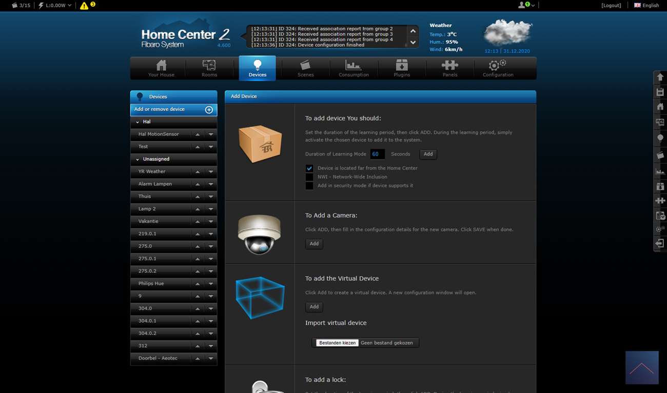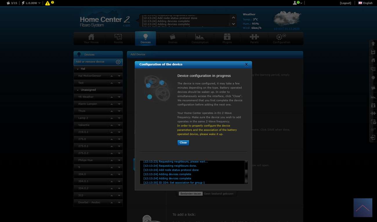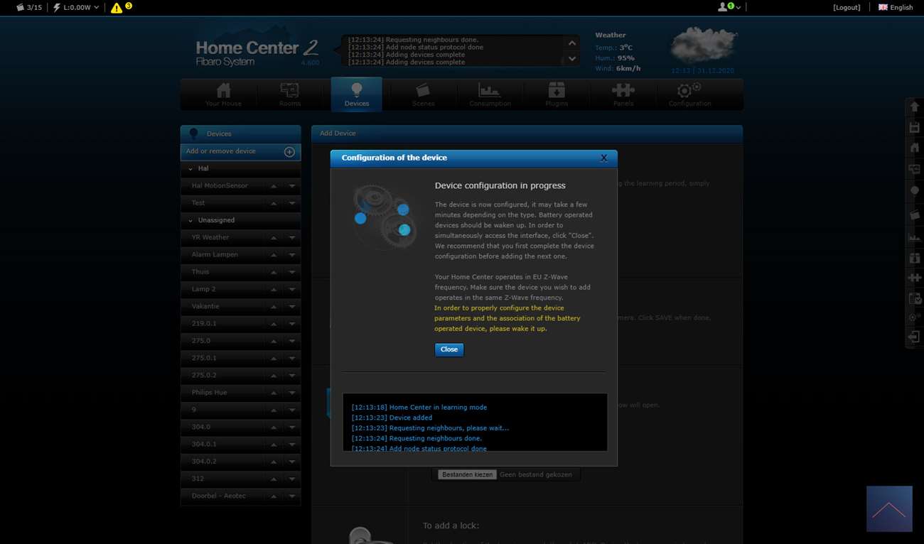 The next controller is the HC2 from Fibaro. The adding is done again by putting the controller in the "add" position and supplying the motion sensor with power again. You can do this by logging in and going to your devices and then clicking "add and remove device". Then tick "add node secure" and press "add".