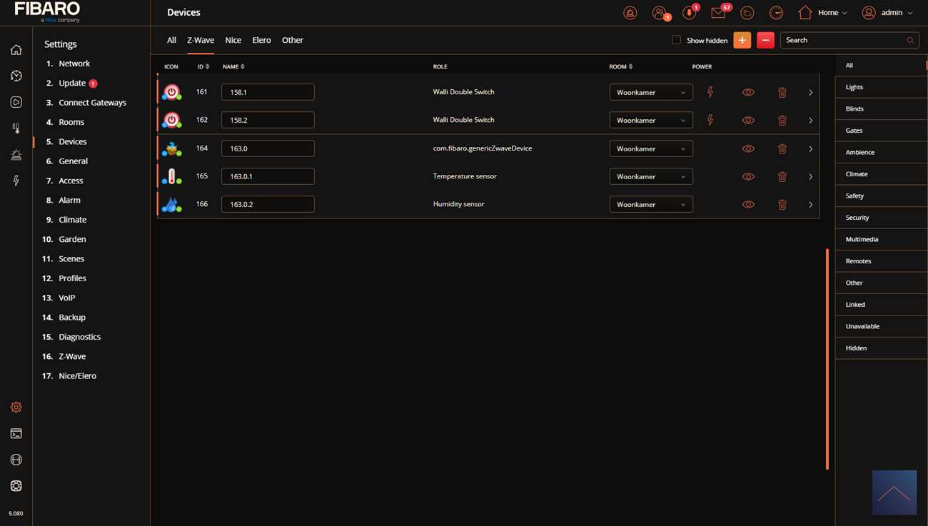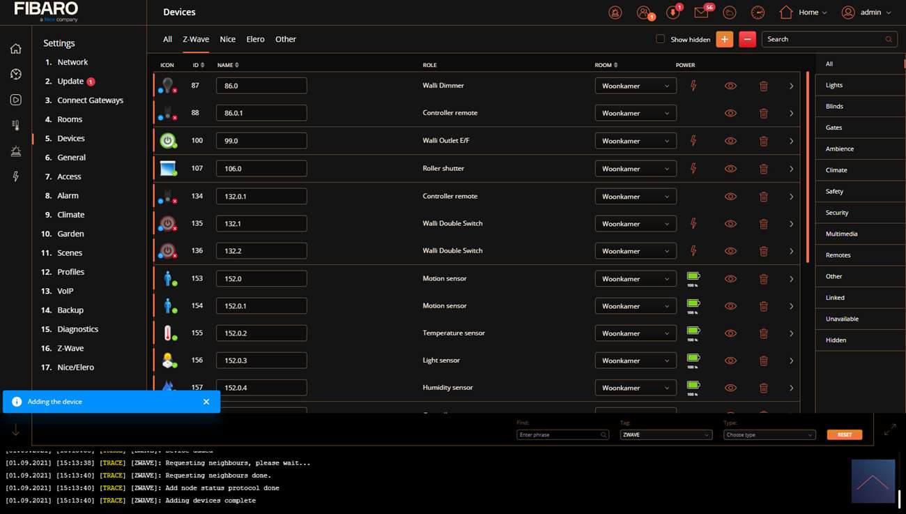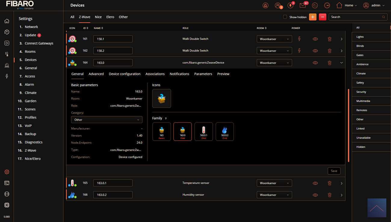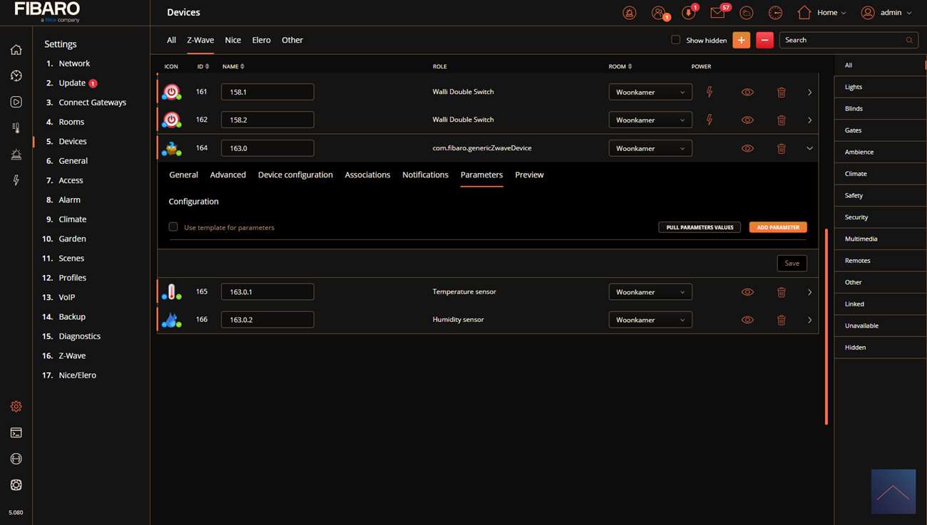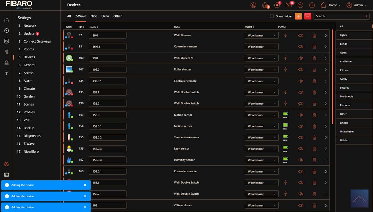 We first supply it with power by pushing it into the socket. After this we log in to the HC3. We go to our devices and press the plus sign. Now start adding by holding the side button for 5 seconds until the LED turns blue and then release it. Do not wait until the LED is off because then the addition will not succeed. The HC3 gives a message that it is "add" and I see the LED of the sensor blinking blue.