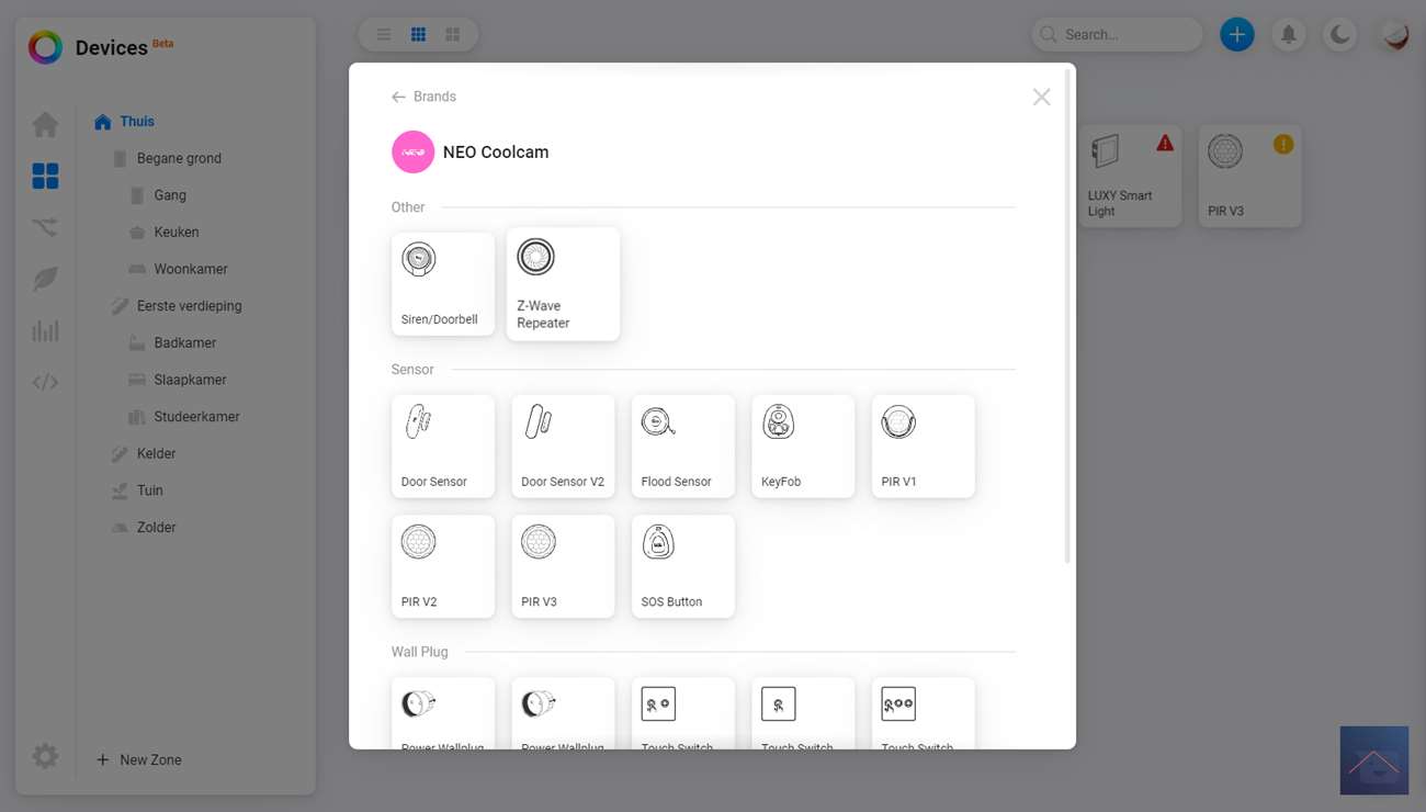 Now we log in to the Homey by going to my.homey.app (or you use the APP) and click on the plus at the top right. Now you search for Neo Coolcam and click on repeater. Now we need to put it into learning mode, this can be done by holding the button on the side for 5 seconds and releasing it when the LED lights up blue. Do not wait too long because then the addition will not succeed.