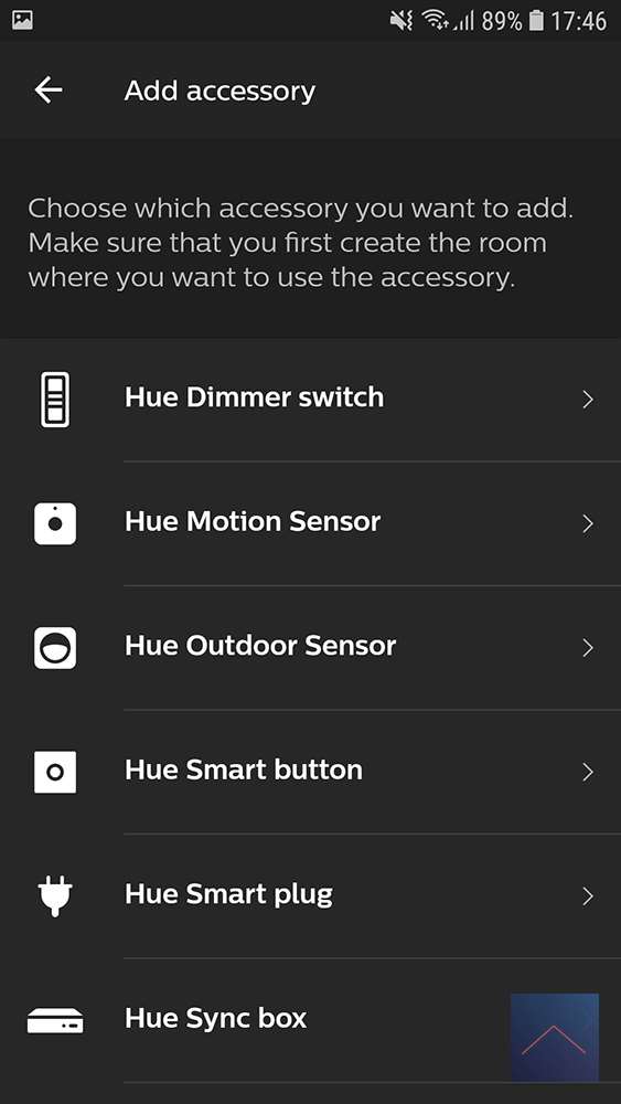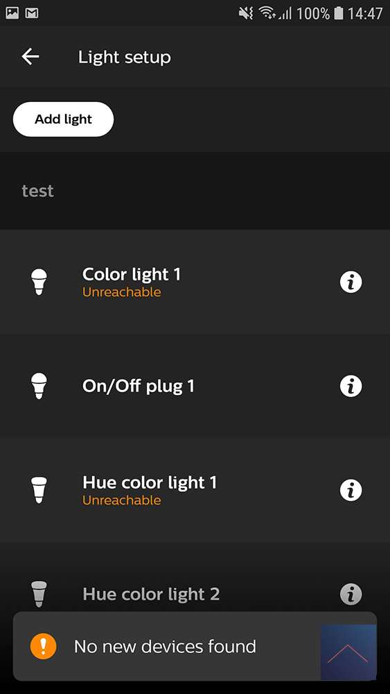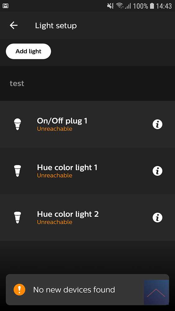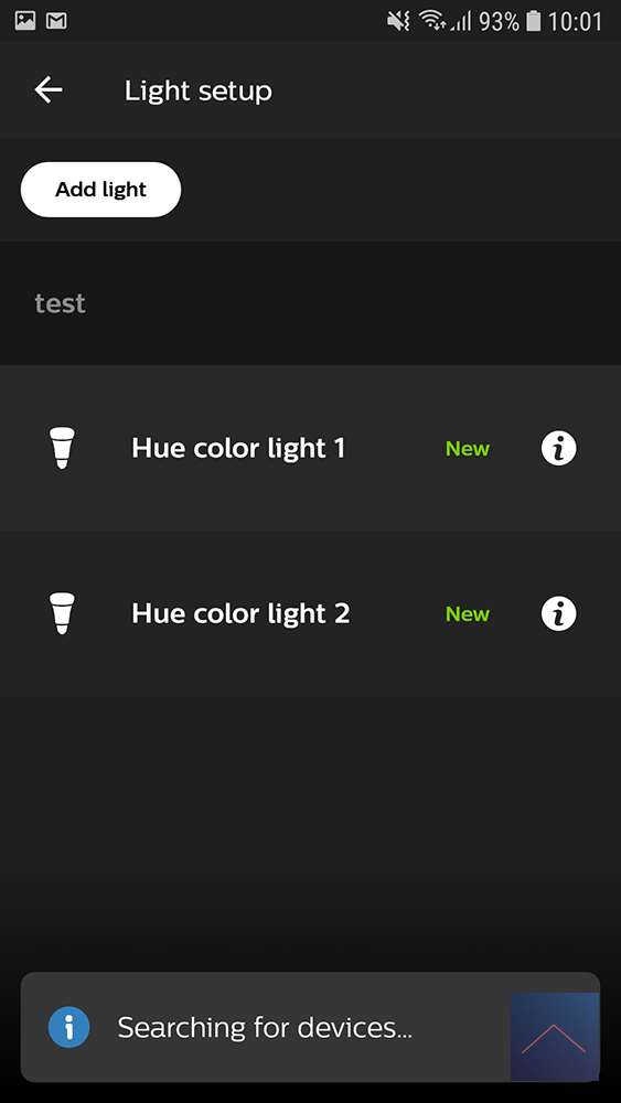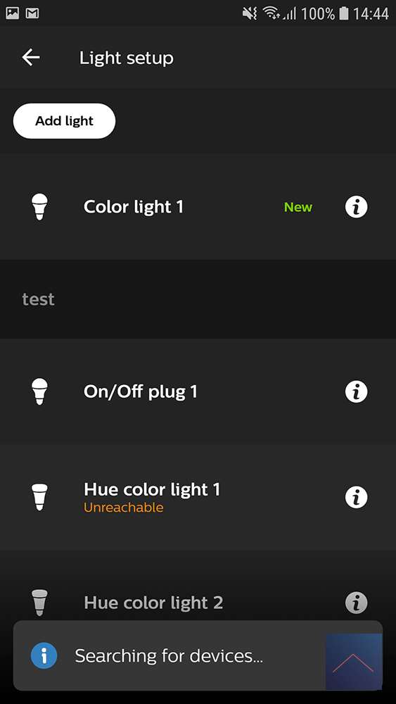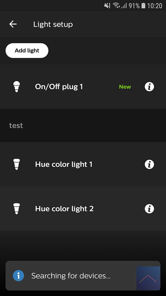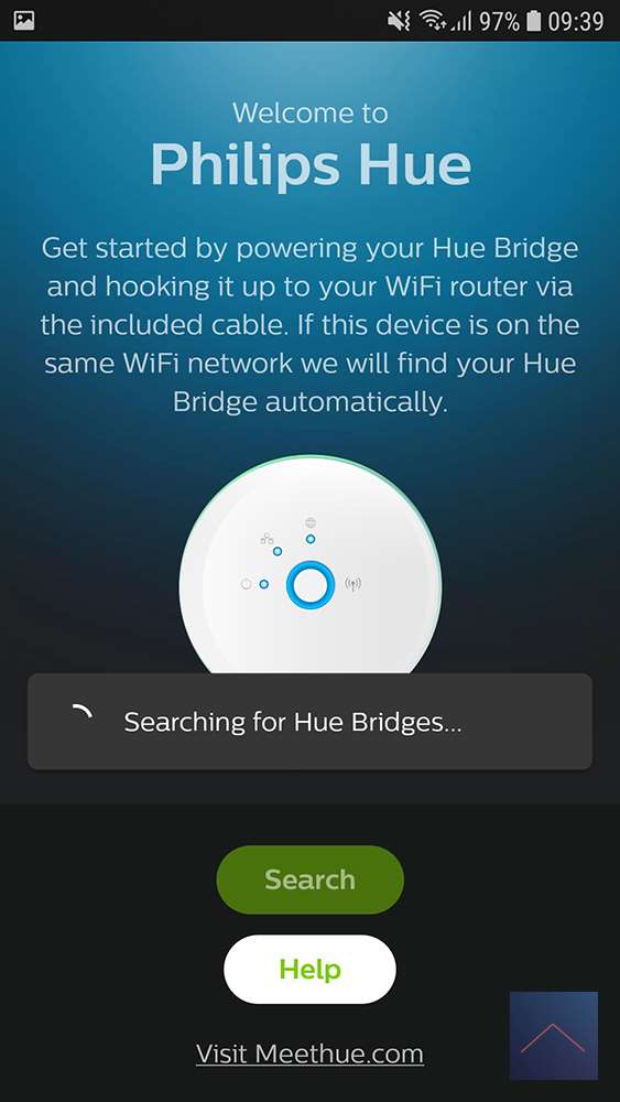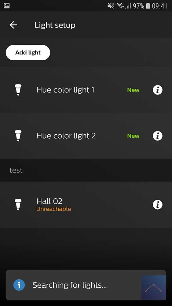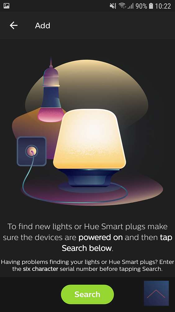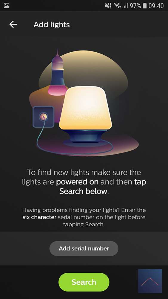 You add Philips Hue lamps, accessories and other brands in the App, first go to the settings tab at the bottom and then you can choose “Light setup” or “Acccessory setup”. Choose “Add light” or “Add accessory” and you will get a short explanation, then select “Search” to have the Bridge searched. When adding a lamp you also have the choice to manually enter the serial number. If you do this you will still have to search.