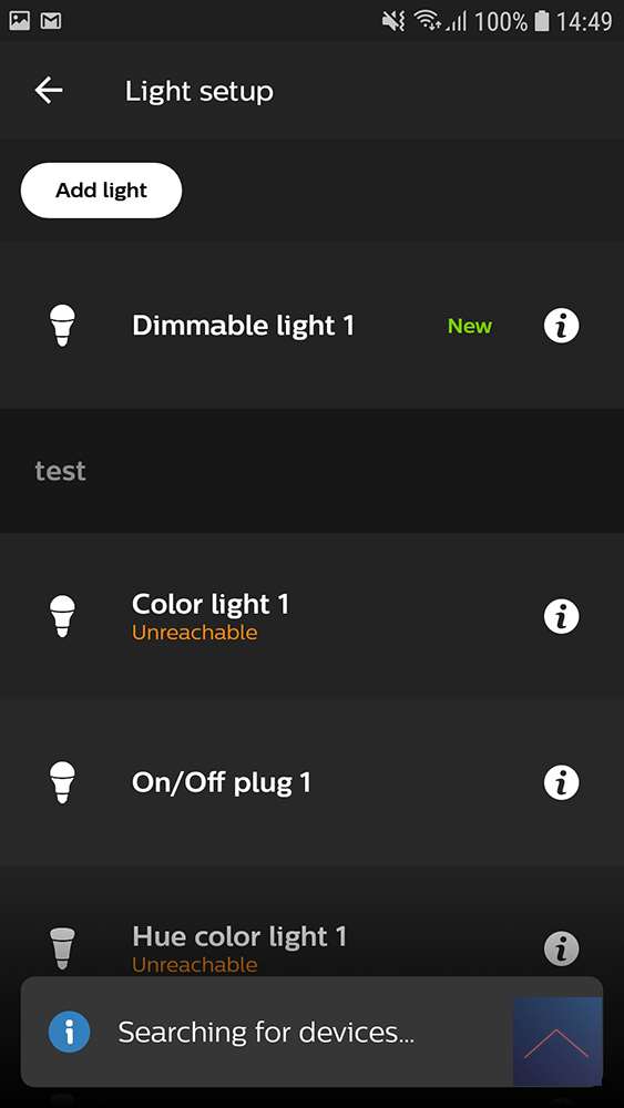 We still have an Innr lamp and will also add it via the Zigbee protocol. The Innr lamp is a cheaper alternative to the HUE lamps. Adding this lamp takes a bit more effort, because you do not see whether it will be in setup mode. So we turn the lamp on and off several times while searching and hope for the best. After the second attempt, the Brige also finds these: