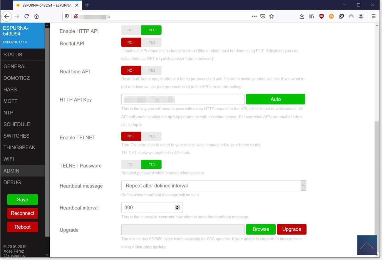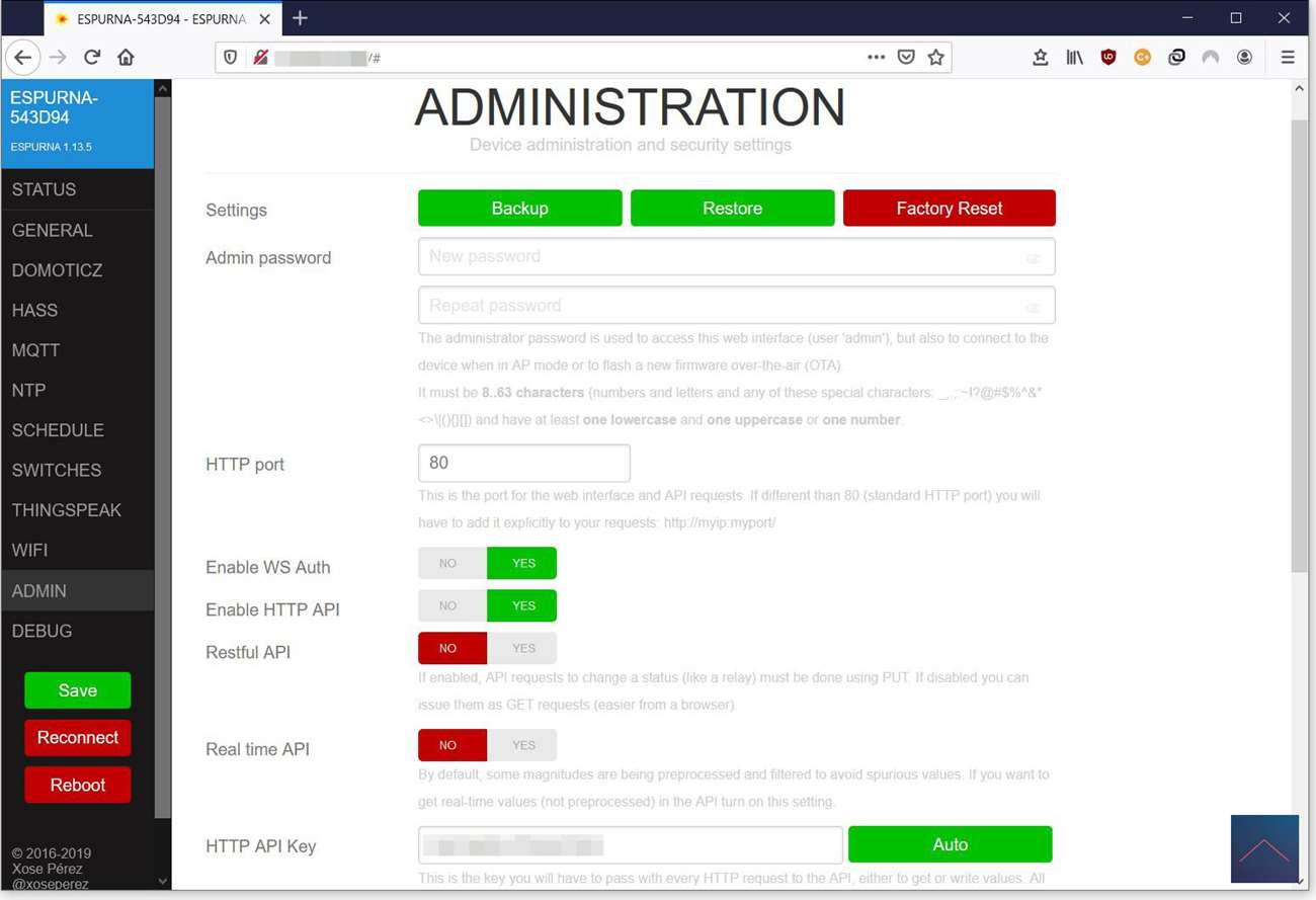 Admin - Backup, API, TELNET and upgrade options.