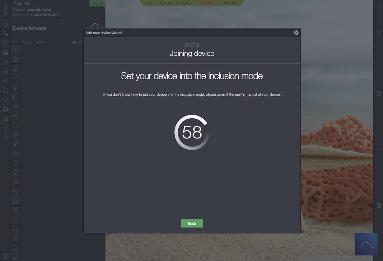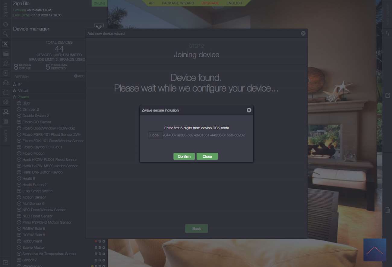 The next step is to login to the ZipaTile and go to your devices. Then click on "add new device" and then on Z-wave. The ZipaTile will first ask to reset the module. We can do this by applying the power to the module and performing the following actions: press the right button (3) 1x, then press the bottom button (4) 1x. The LED will turn white and then you have to press and hold the right button (3) for 4-9 seconds. The LED will now flash green and light up fully after 10 seconds. After this you repeat this action again. As a last step I have to enter the SDK code. You can find this on the sticker supplied.