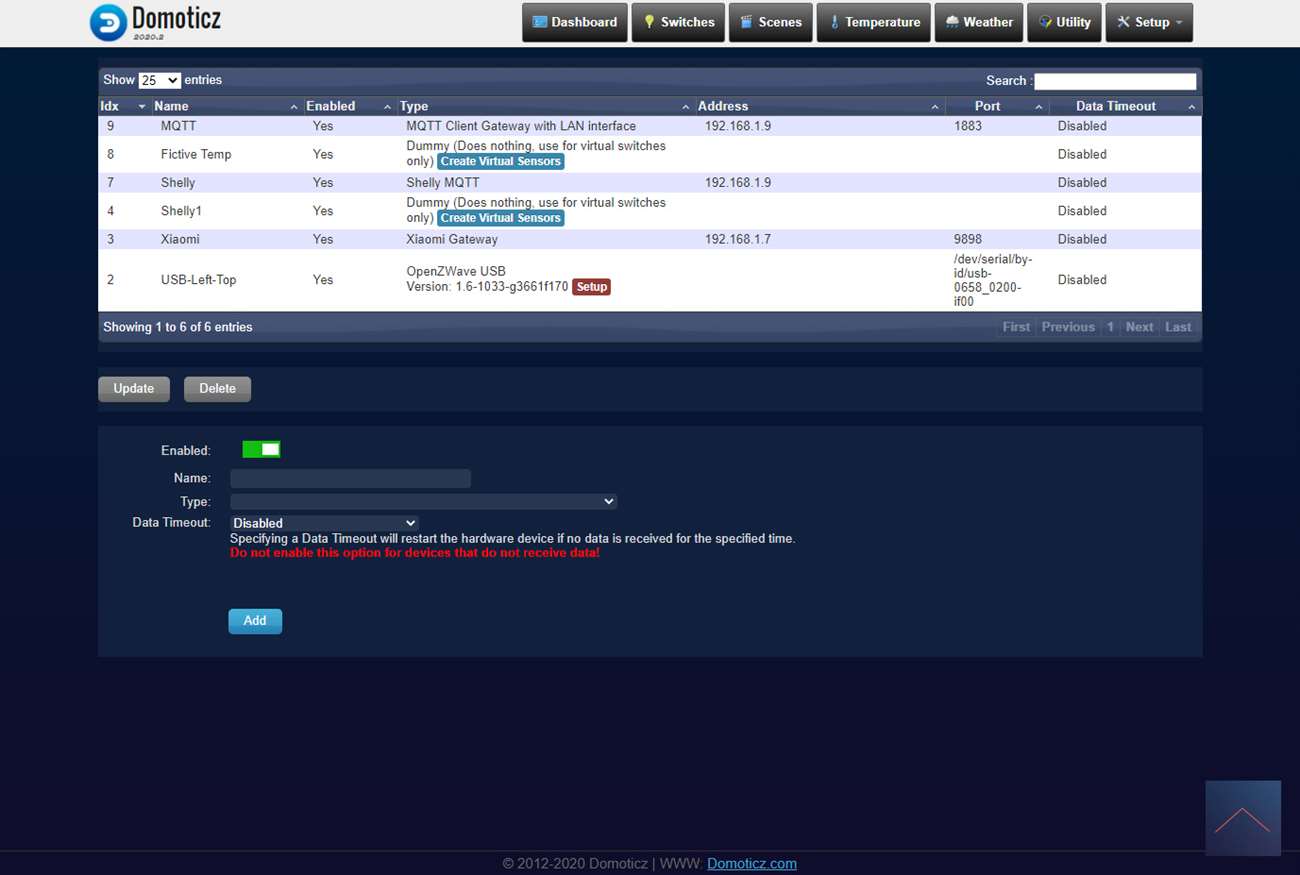 The next step is to log in to the Domoticz and go to "Setup", "Hardware" and then go to setup again at the USB stick.