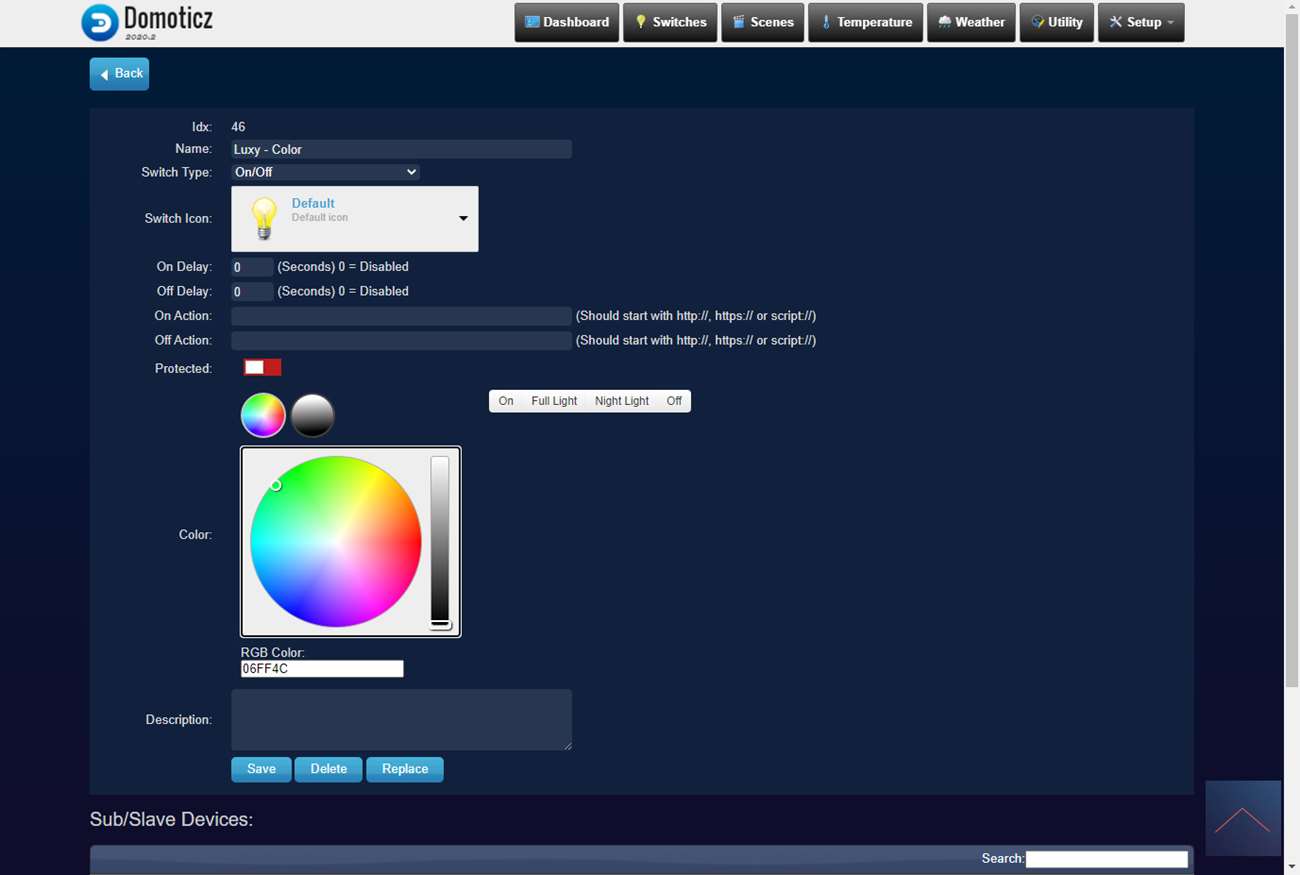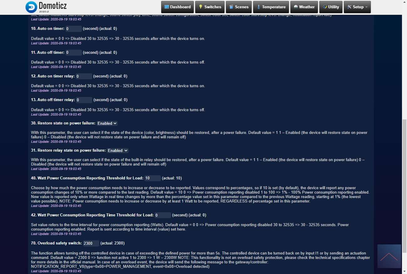 I can dim the LED, turn it on/off and change color. I can also turn the relay on/off. I also see the total consumption and current consumption of the connected lamp (relay).