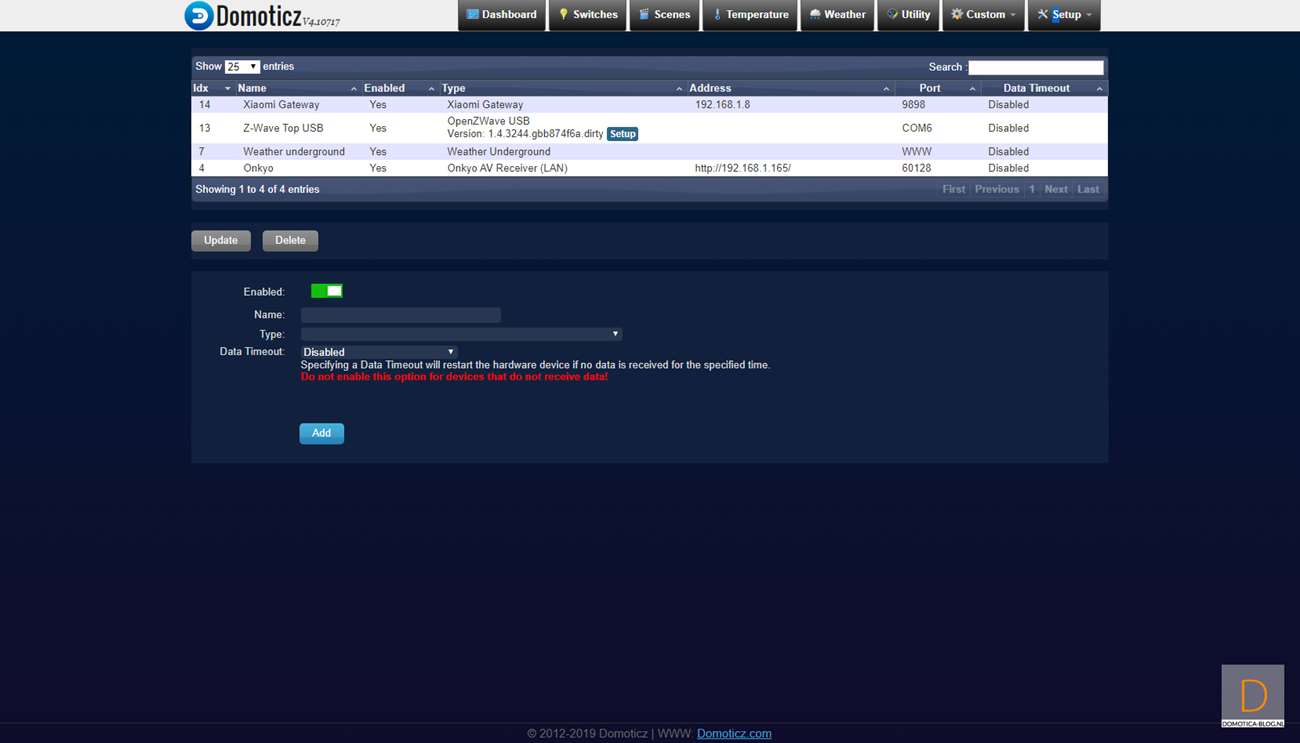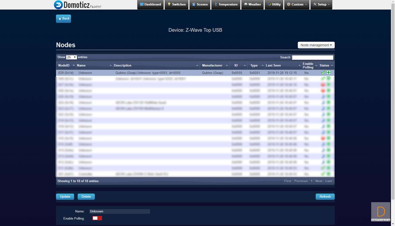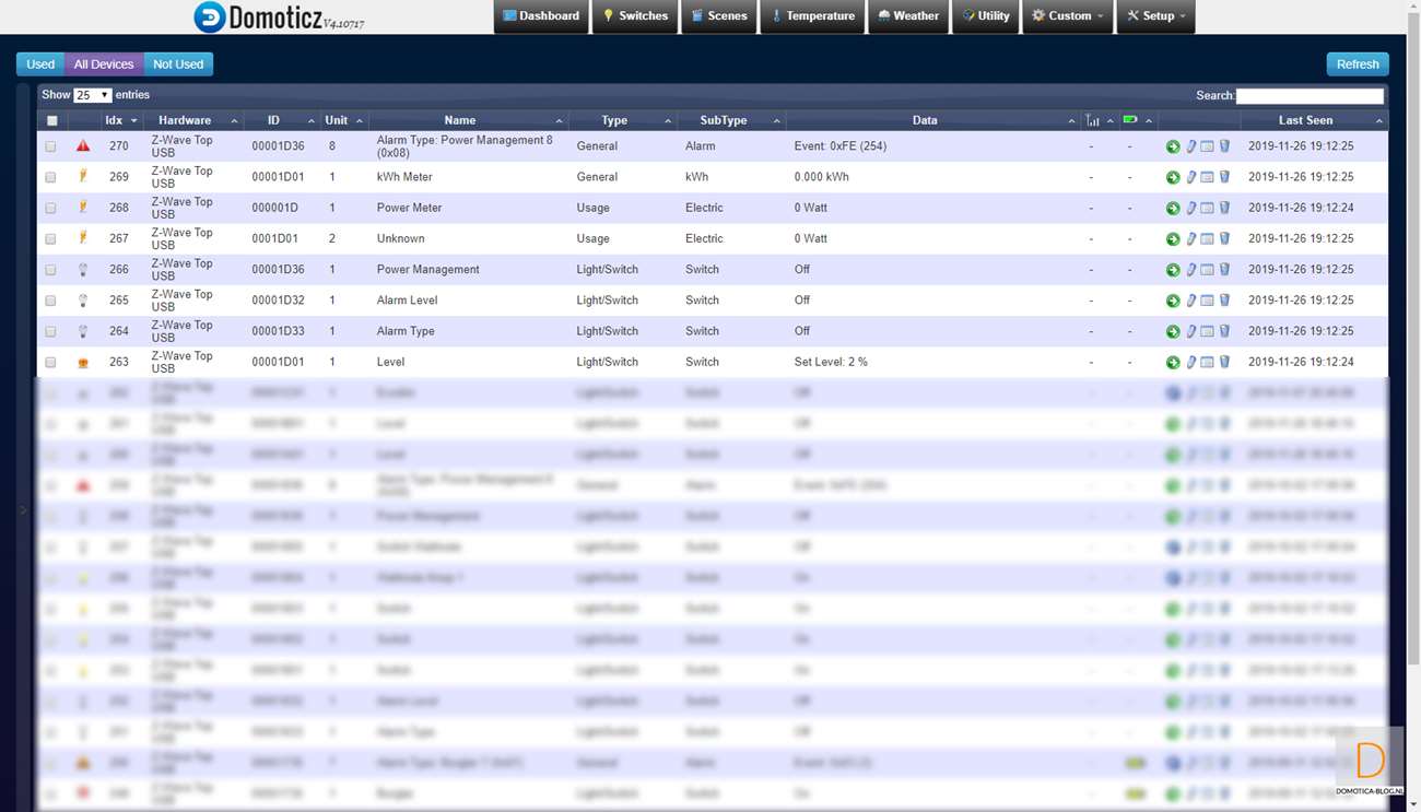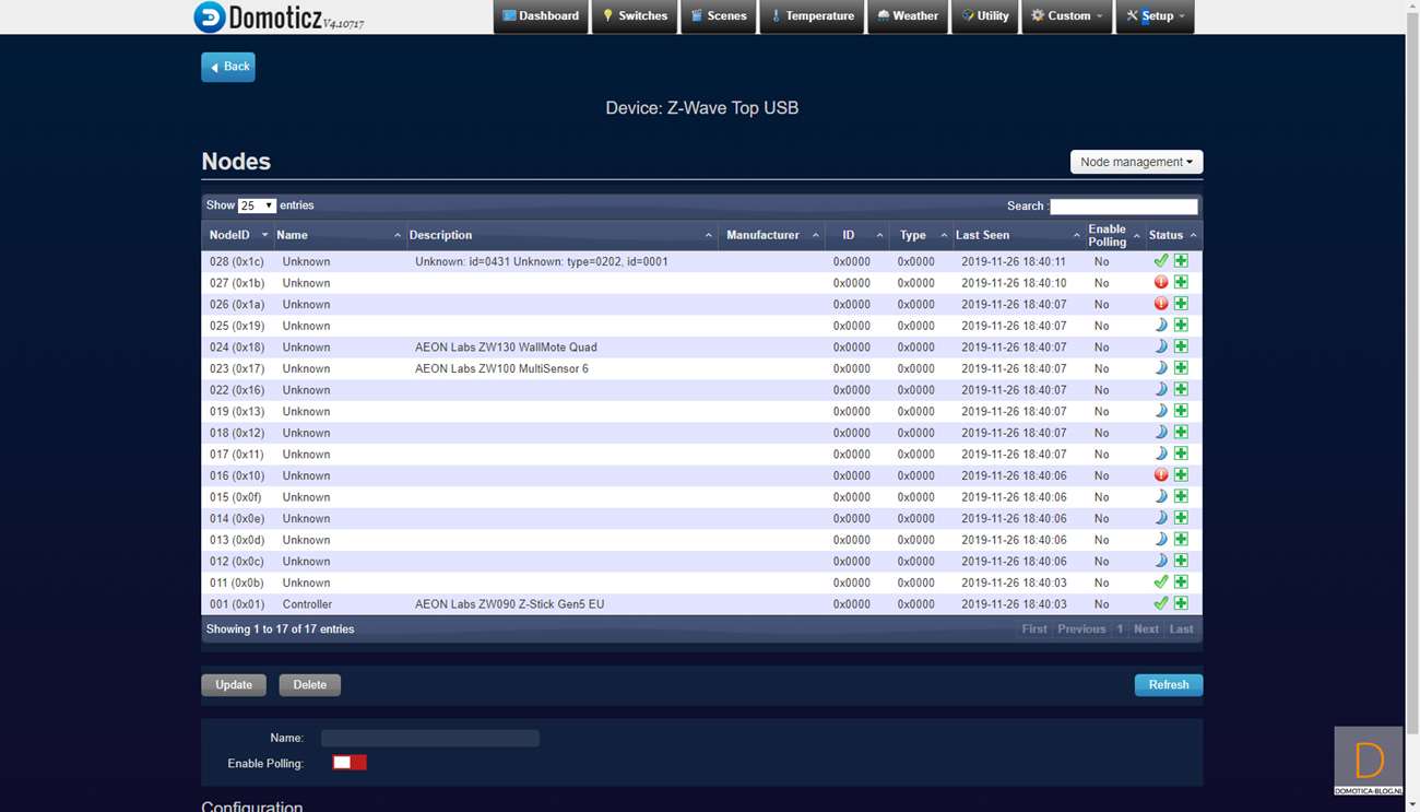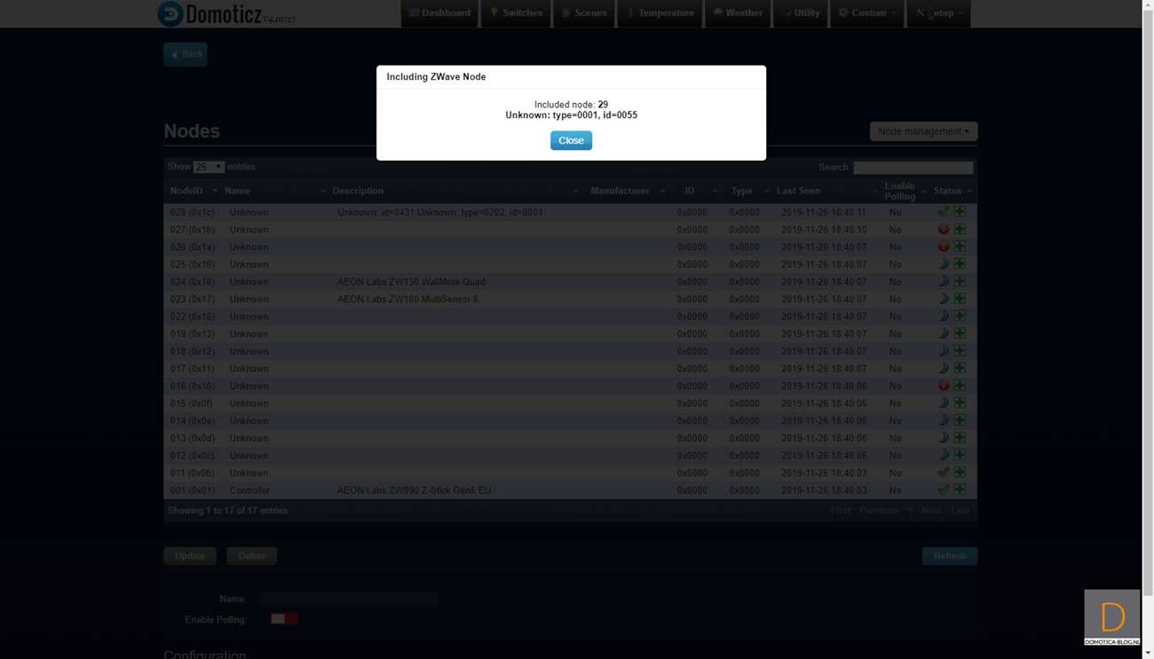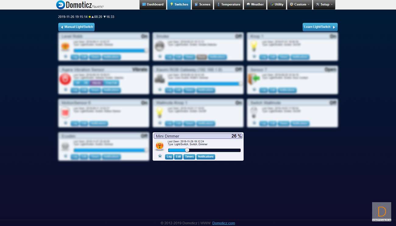 Make sure there is no more power on the wall switch and connect the dimmer according to the enclosed diagram. Wait a while before turning the power back on. We will first log on to Domoticz and add it there. We add this by going to the menu item "setup" and then to "hardware". Then click on setup of the Aeon Labs controller and go to include node secure (on the right). After this you provide the dimmer with power. He was found immediately and see him at my devices. I see an on / off switch, a dimmer, the total consumption and current consumption. Completely complete.
