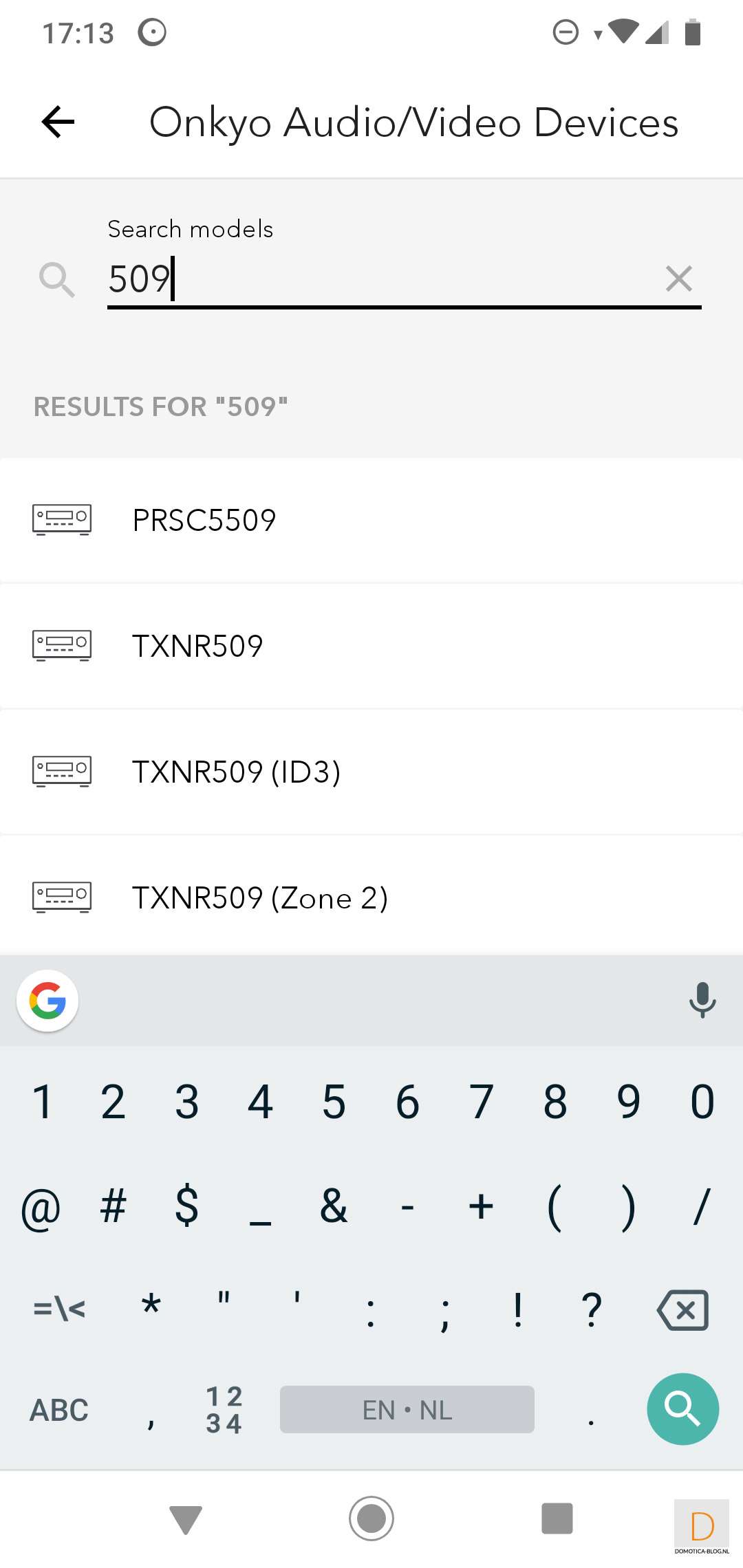 You can add devices via the APP. You can arrange this immediately after startup by pressing "Add device or service". The first question is what kind of device you are going to add. In our case this is an Infrared device. Then he asks what kind of device and where you live. The next screen shows a search bar and the most common brands. Because we have chosen the 'amplifier', we immediately see Onkyo. If you click on this you will get a list of type numbers. It is striking that there is a considerable database behind it. We select the TXNR509 and the correct data is downloaded immediately. After this we can create scenes. More on this later.