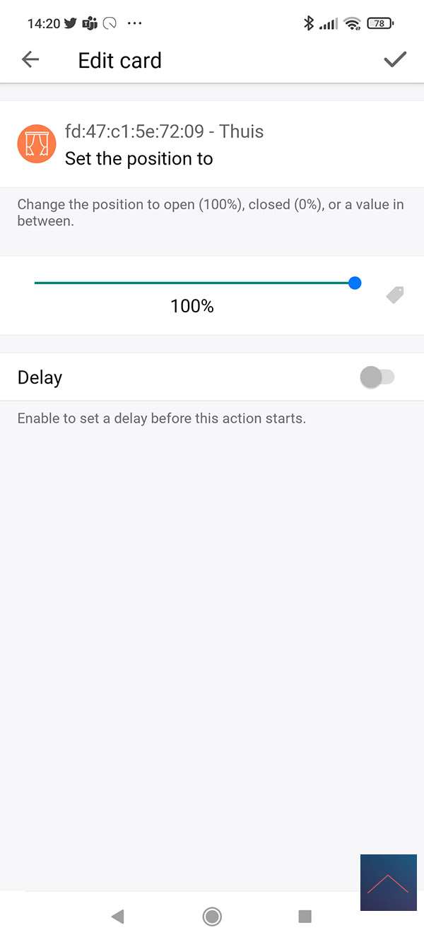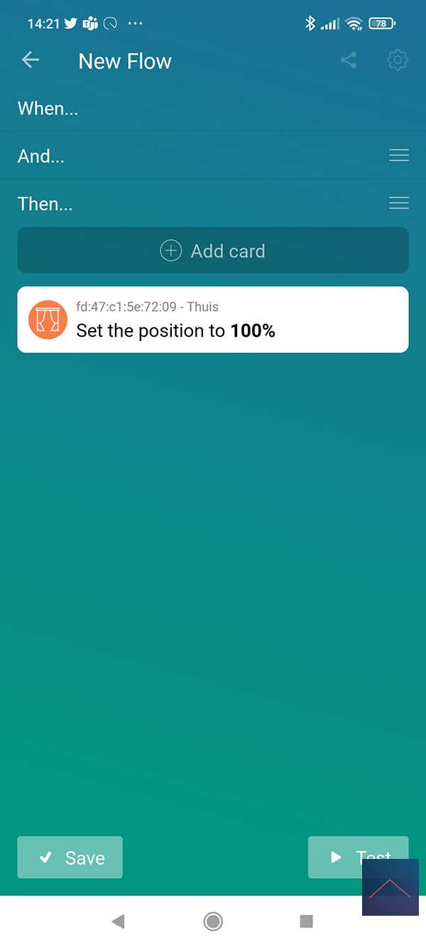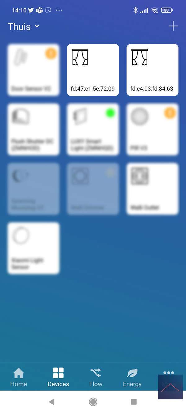 The Homey turns each motor into 1 separate curtain, so I see 2 curtains in the APP. In my case it should merge because I have a curtain that opens/closes towards the middle. This is a bit inconvenient if you want to open it. You should then click twice. To solve this, you can create a virtual switch that opens/closes the curtains by means of a flow.