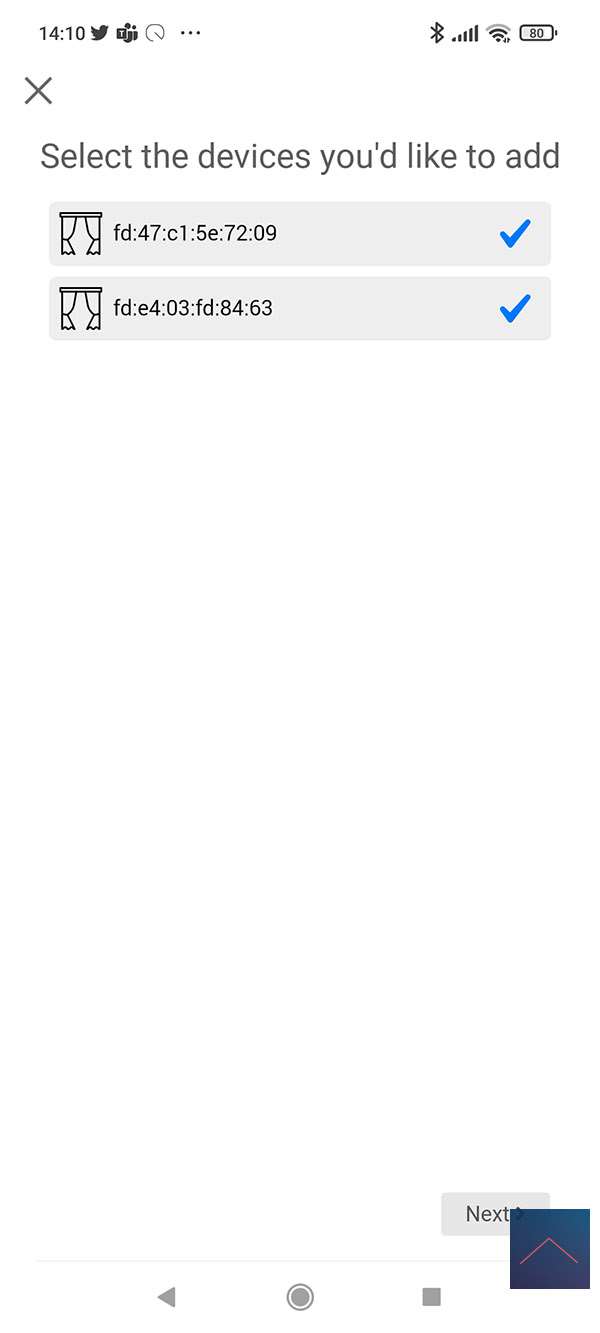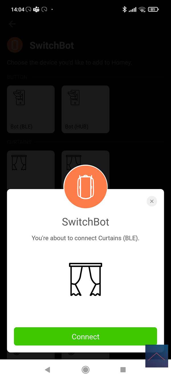 You log into the Homey APP and press the plus sign and search for SwitchBot. Then we select the Curtain (BLE) and install the APP. Now the Homey will search for the curtains. In my case it finds 2 curtains and I can add them.