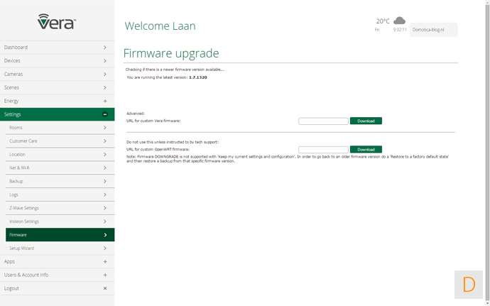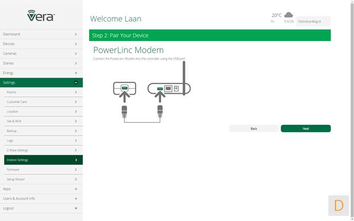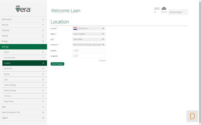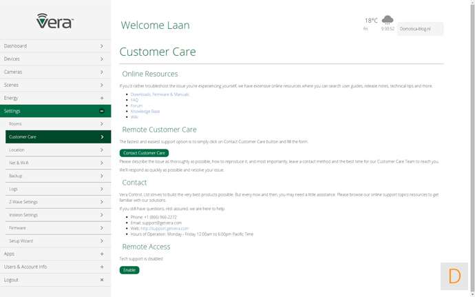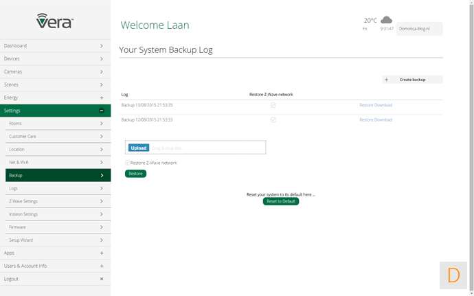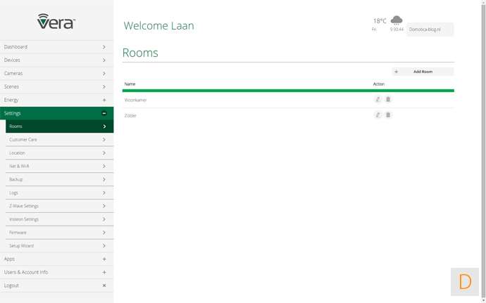 In this panel you will find the various settings of your network, a backup option, your rooms, and the setup wizard. Here you will also find the option to give Vera access to your controller. Fine arranged.