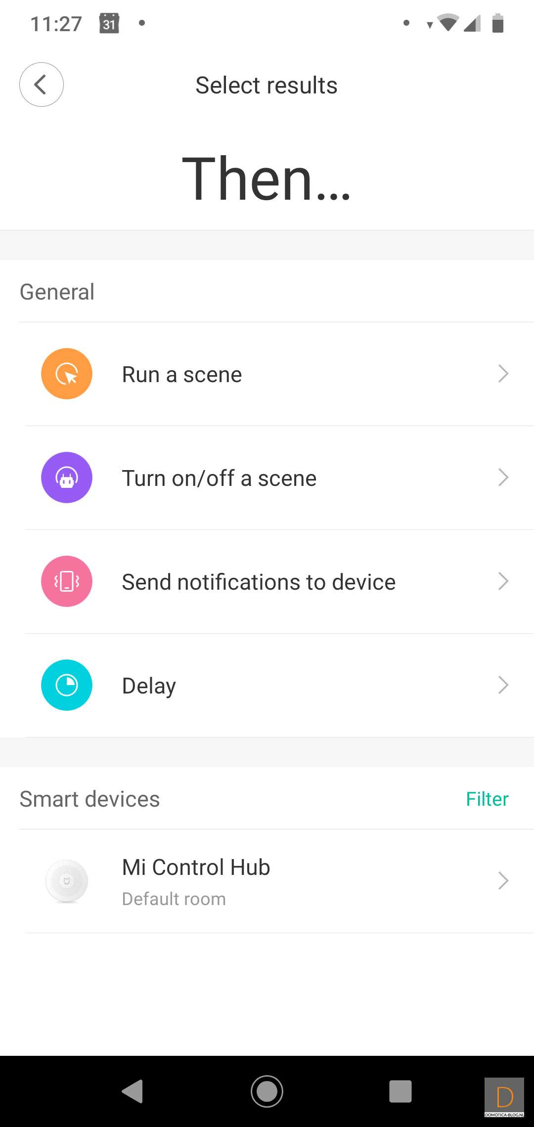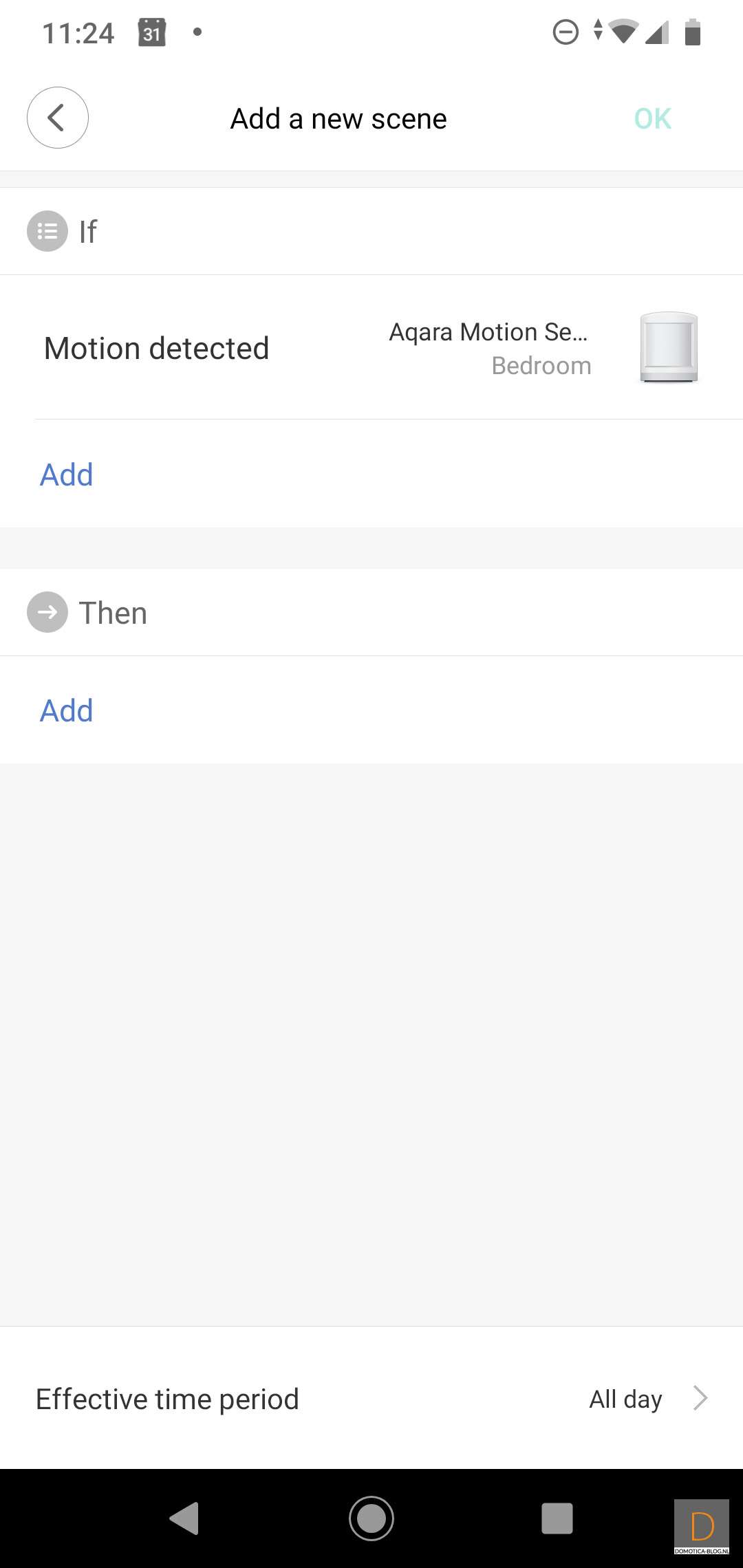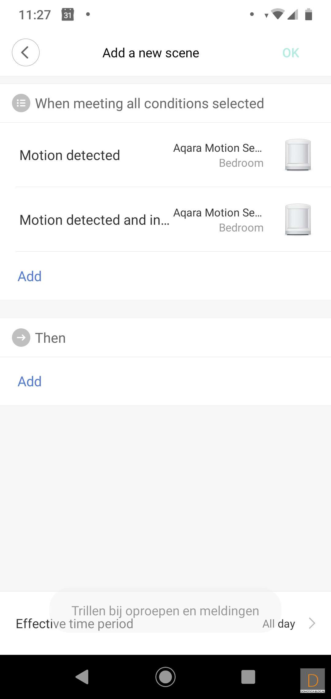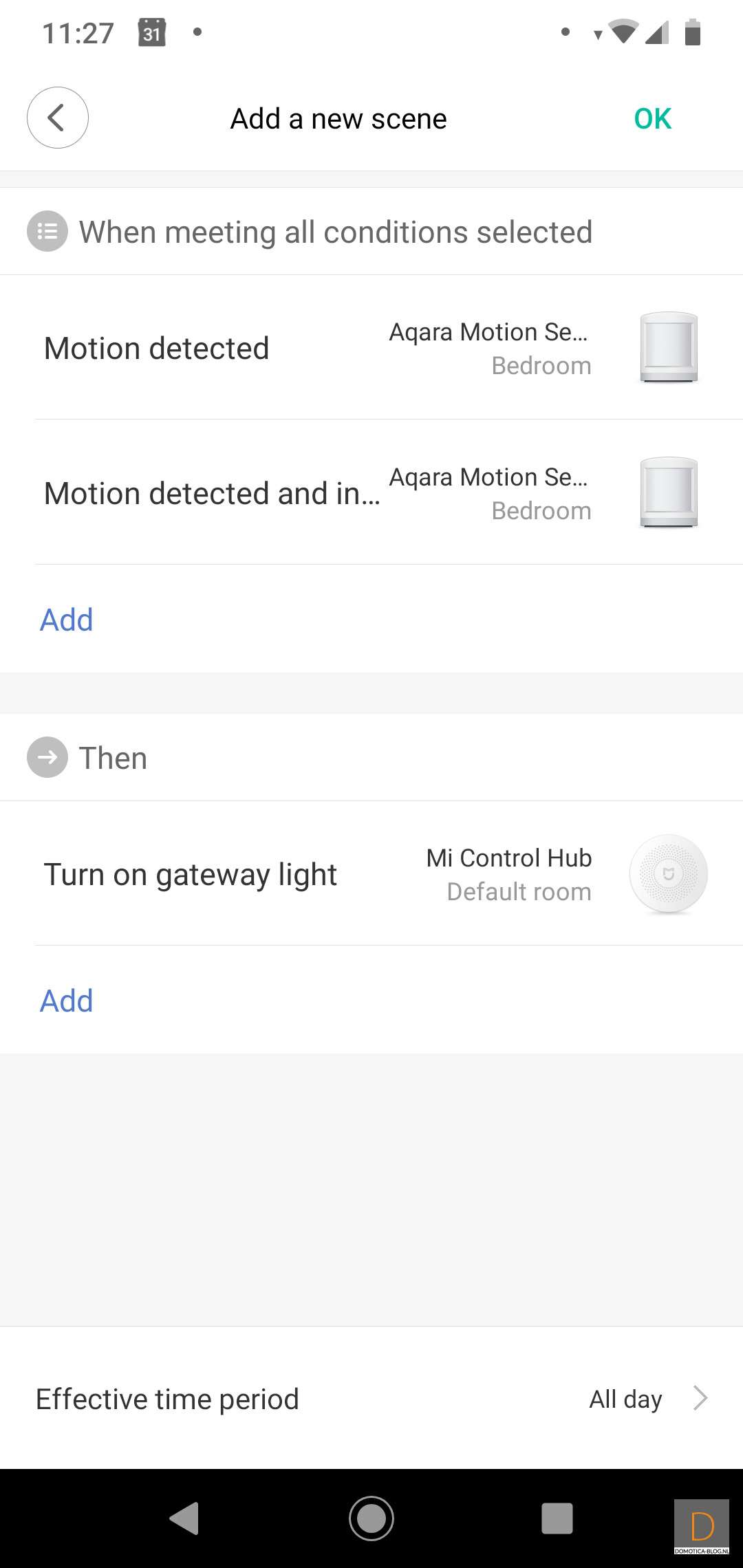 First I create 2 conditions; 1 if there is movement and 2 if the light meter has a low value. We then indicate in the Then column that the gateway must be switched on.