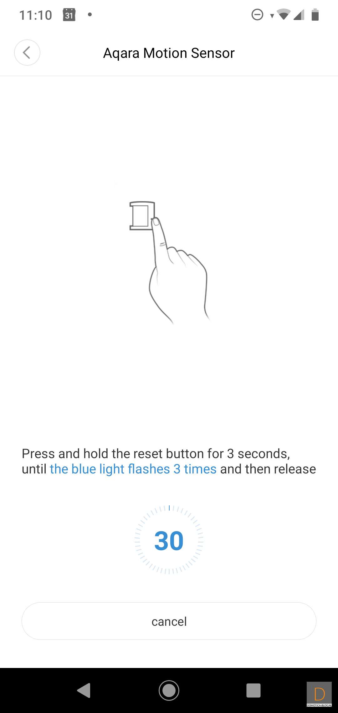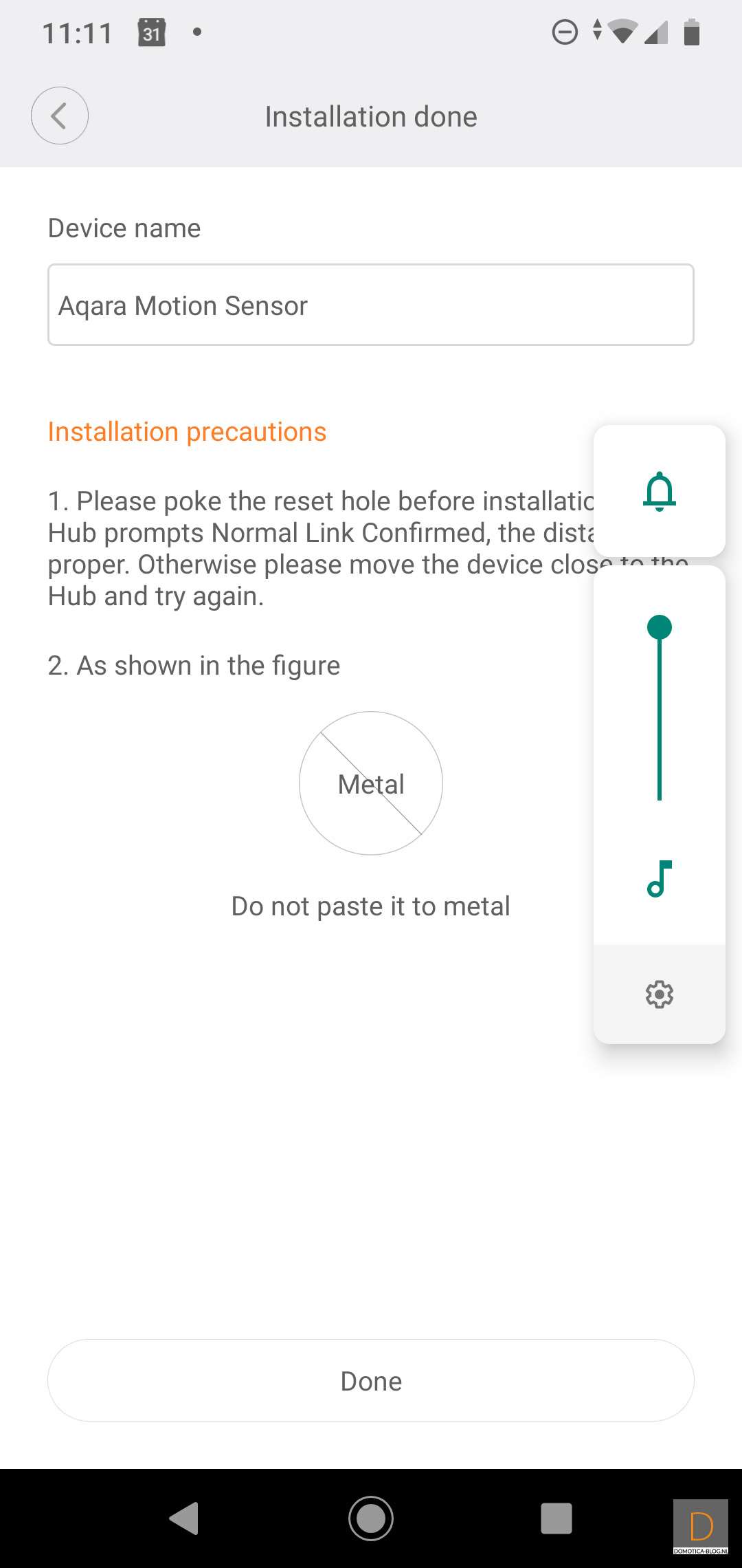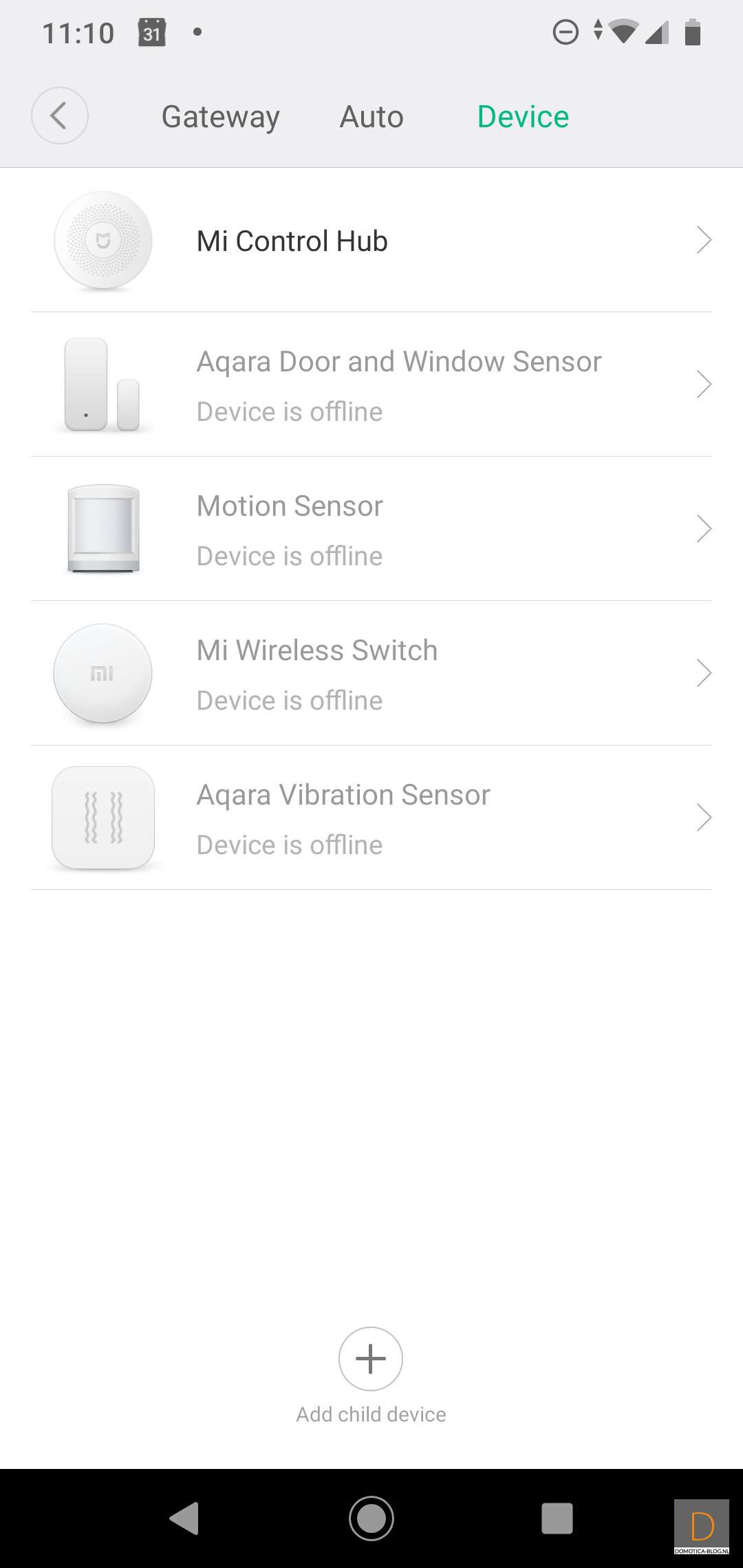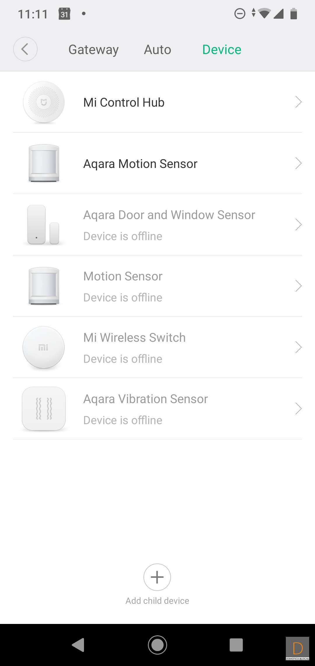 First we are going to add this sensor to the Xiaomi Gateway. This should of course go without problems since this is their own product. You can start adding by logging in to the APP. And go to your devices and then press "Add child device". You must then look up the Aqara Motion Sensor to start the addition. Then how to press the button on the side for 3 seconds. The gateway will call out a nice Chinese text for you (so don't be shocked) and the sensor will light up blue. The addition went without problems. Xiaomi gives a tip to press the button on the side again when the sensor is in place.