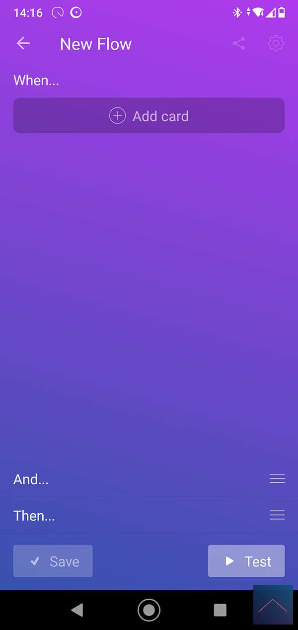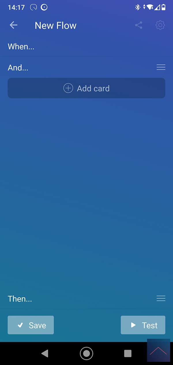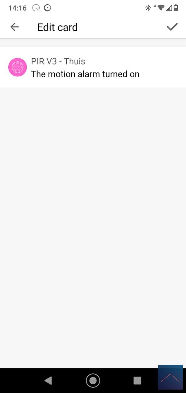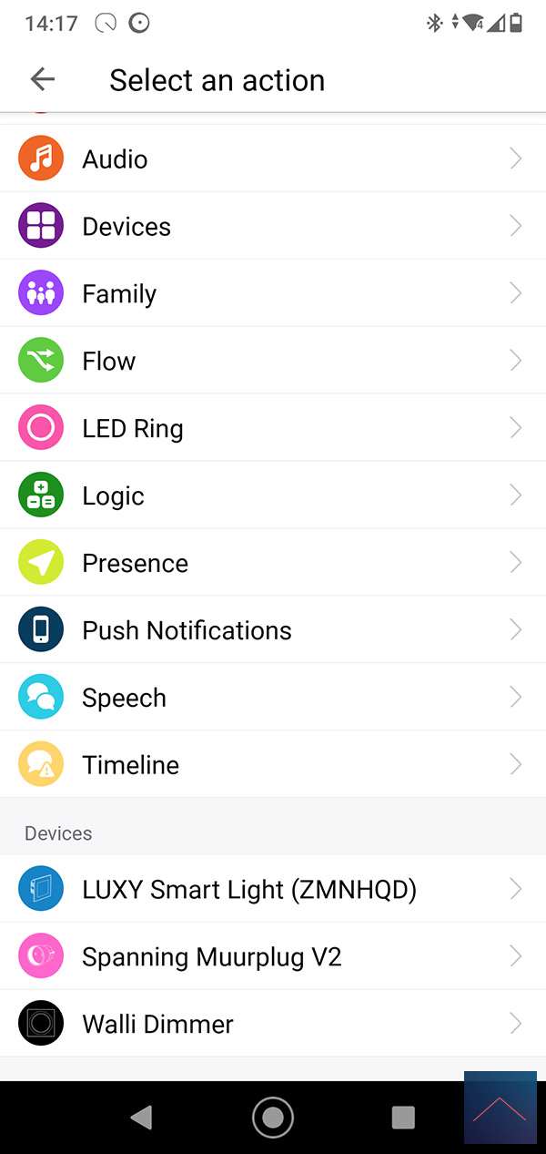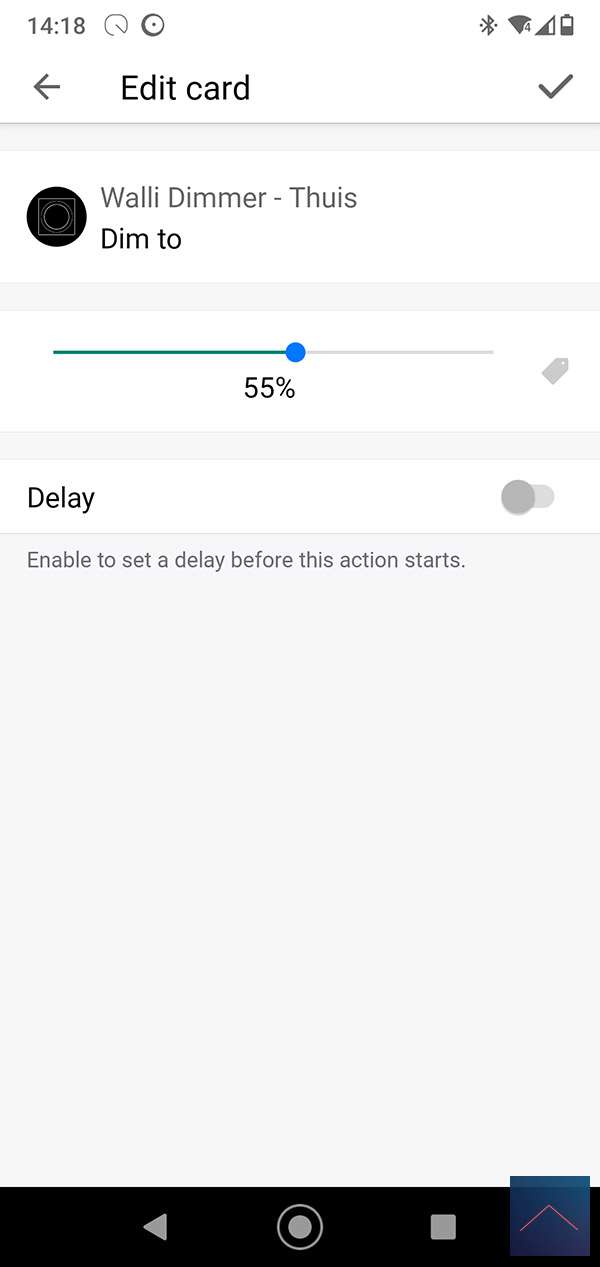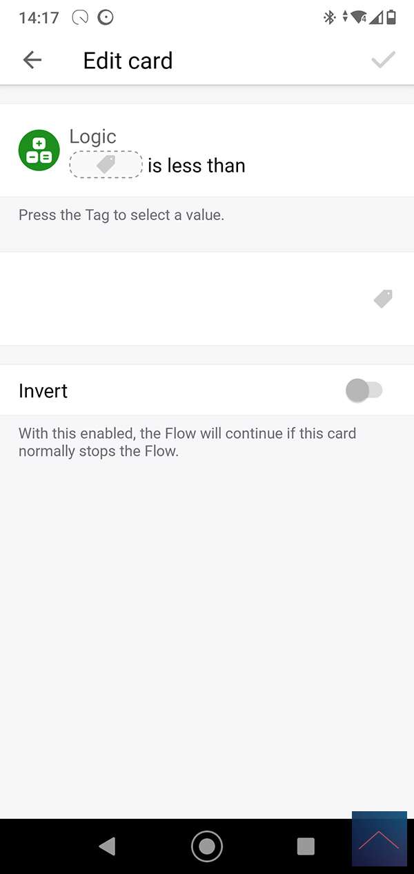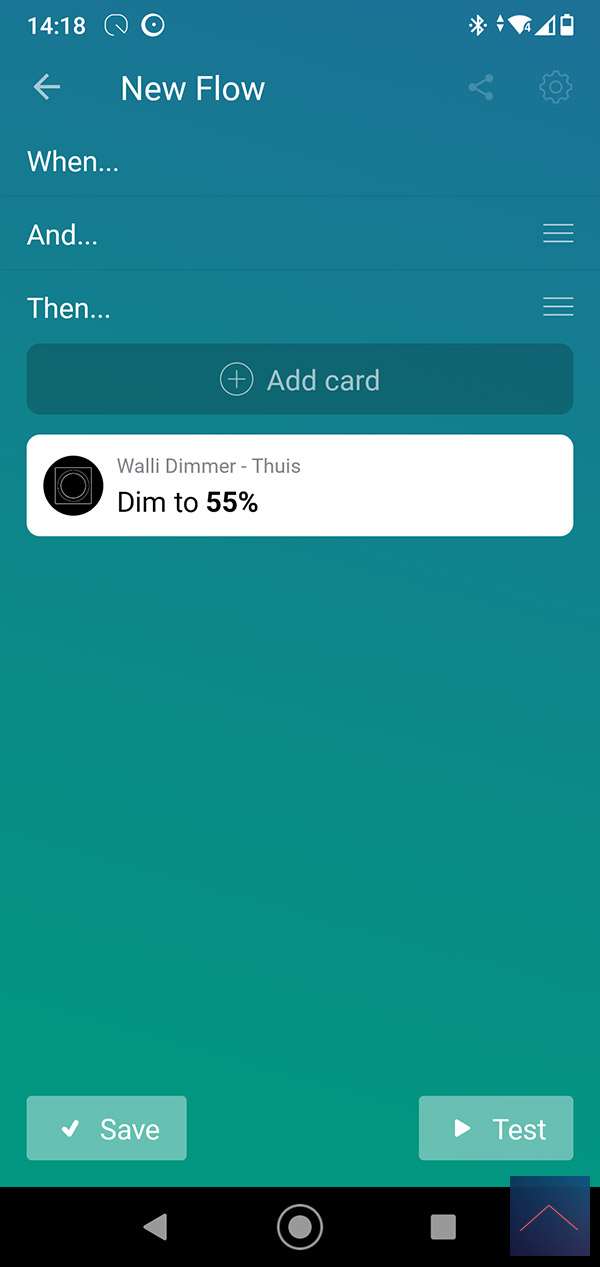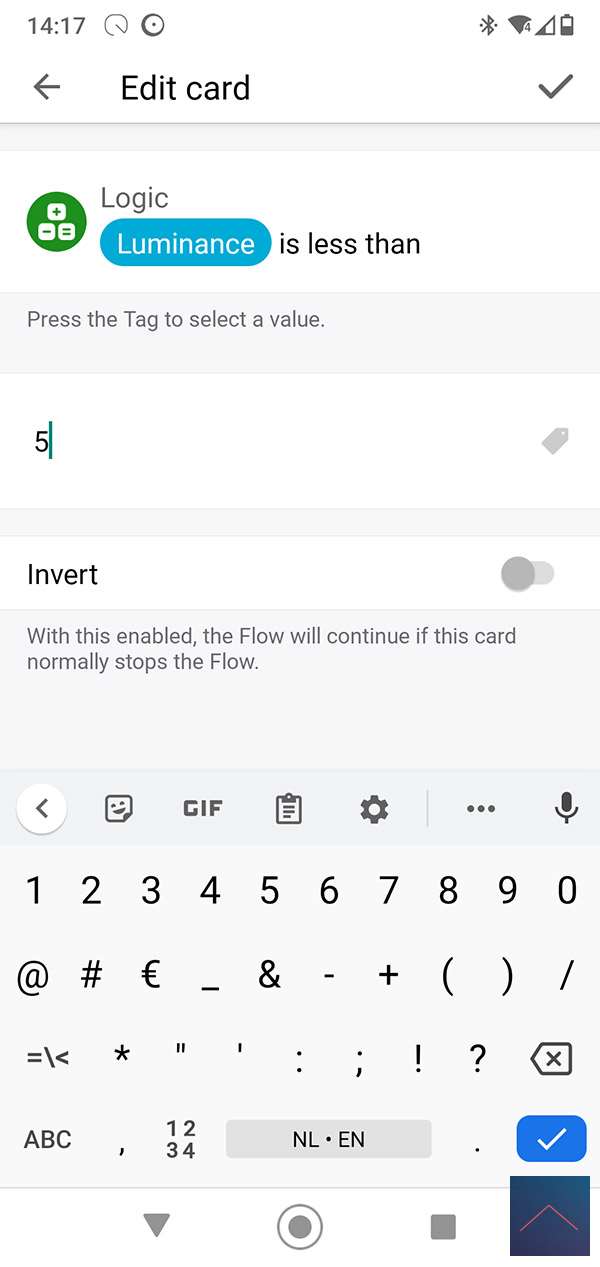 We create a flow for this with the motion sensor as a trigger. At the AND column we check the value of the sensor. This must be lower than 5 LUX, you can use the logic card for this. Finally, we turn on the lamp.