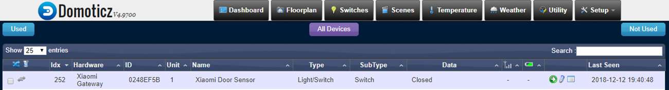 First, add the sensor to the Xiaomi Gateway (see above). It will then automatically appear in Domoticz next to devices and you don't have to do anything else.