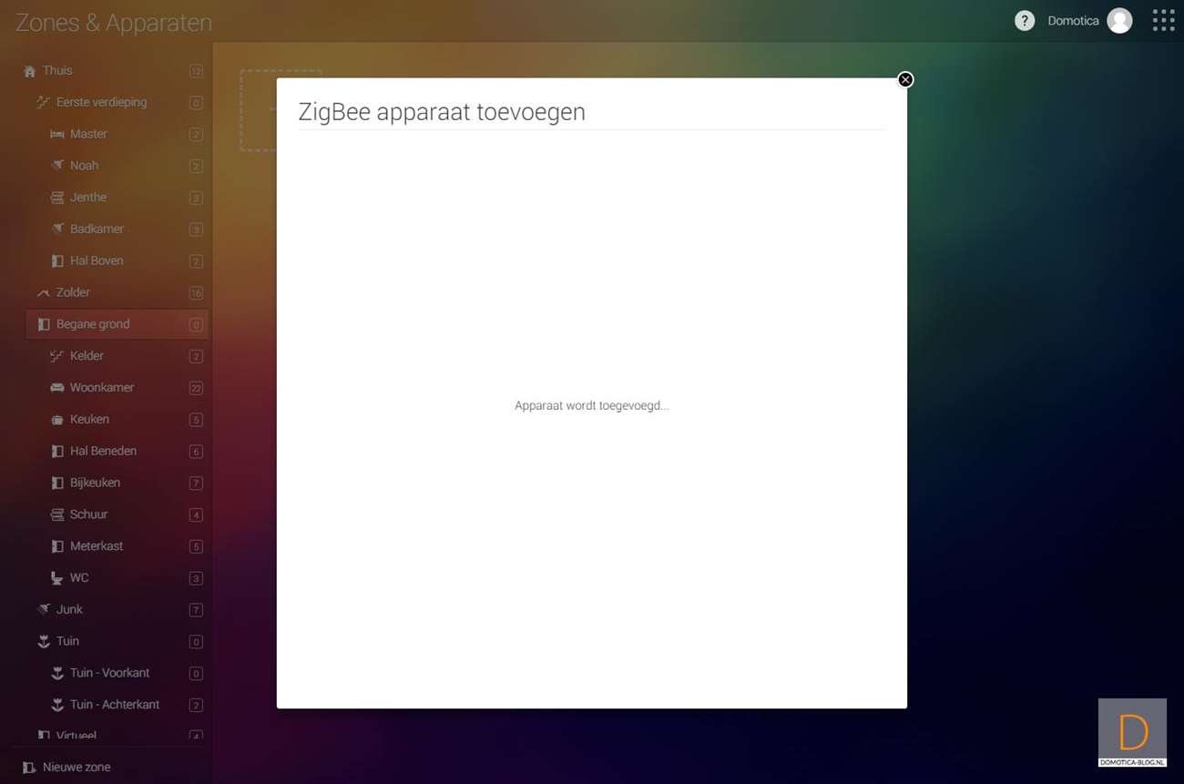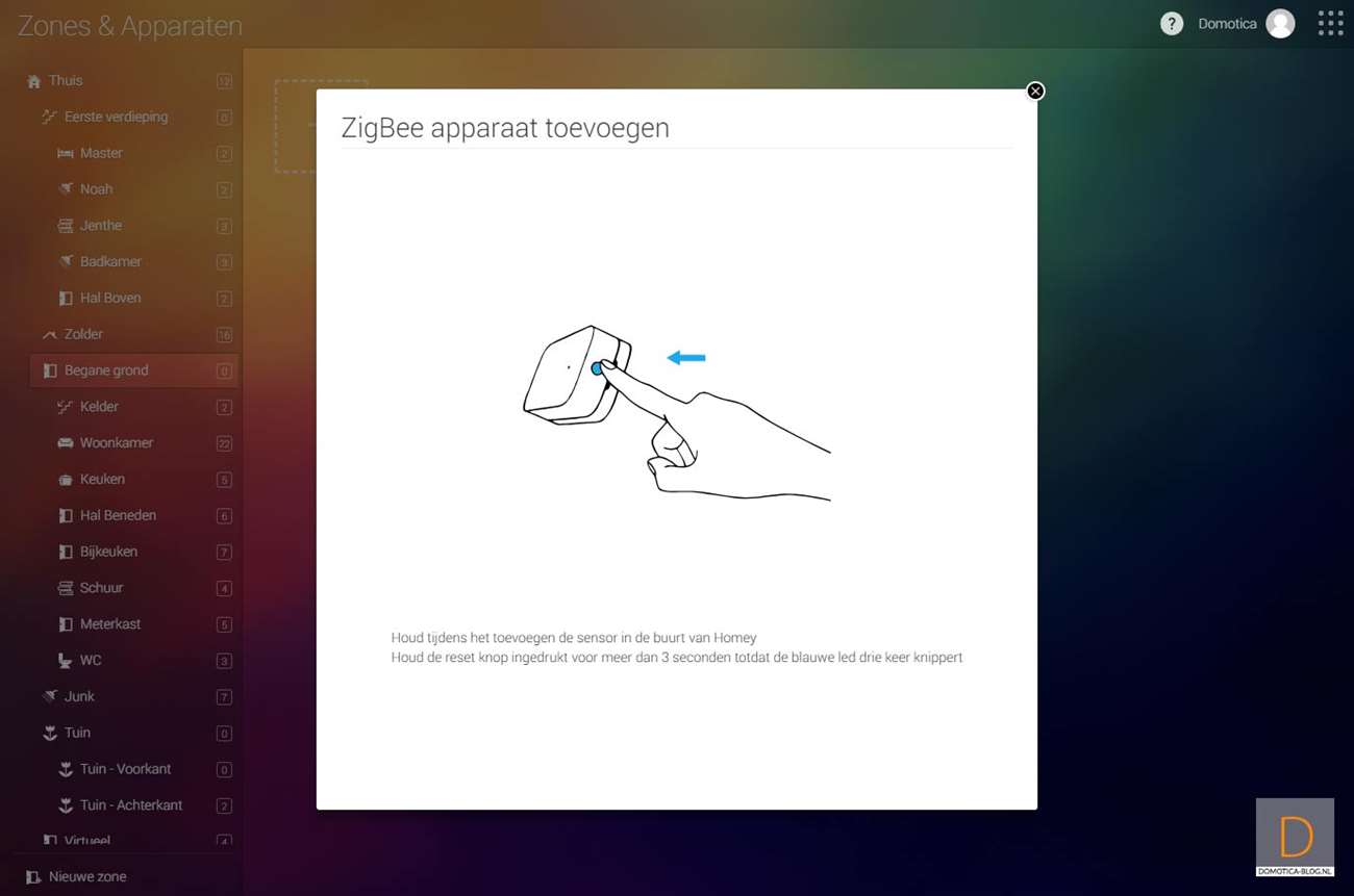 To start adding, press the button on the bottom for 3 seconds. The LED will flash blue. Then keep pressing the button every 2 seconds to keep the sensor awake. Continue to do this until it is completely added by the Homey. I see the sensor appear and the opening / closing of the door is registered. The only thing missing is the battery status. Make sure you keep the sensor close to the Homey. I have noticed that adding it is difficult if you keep it far away.