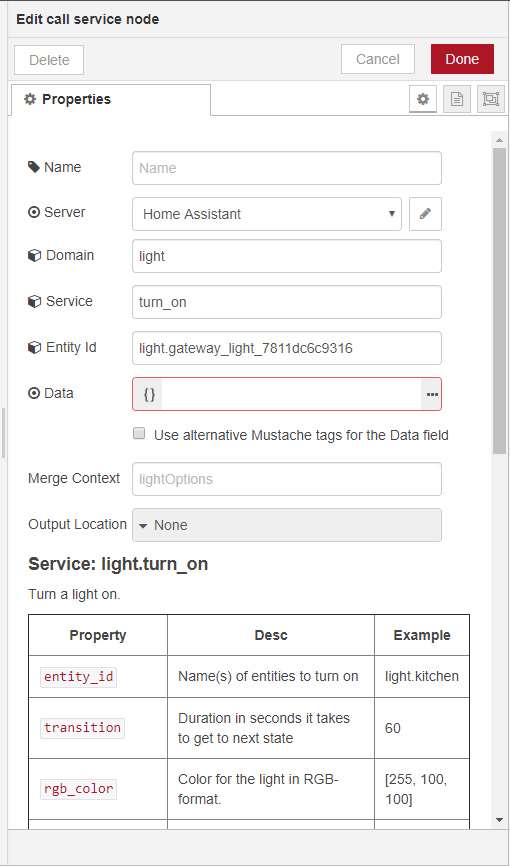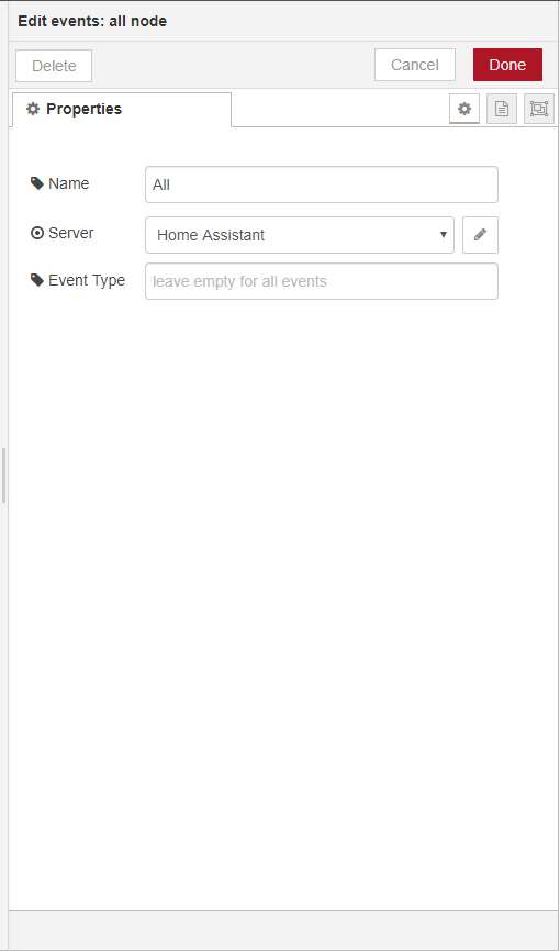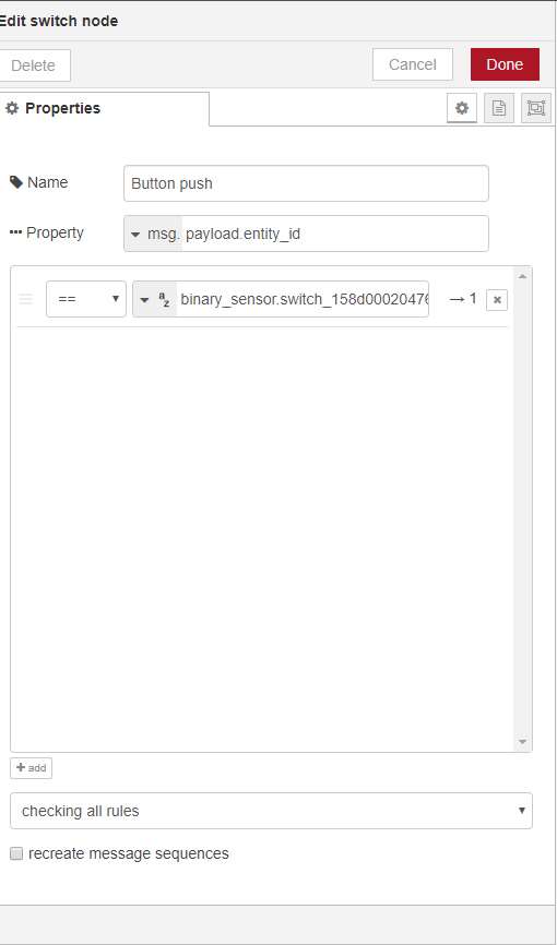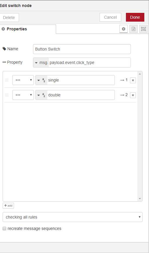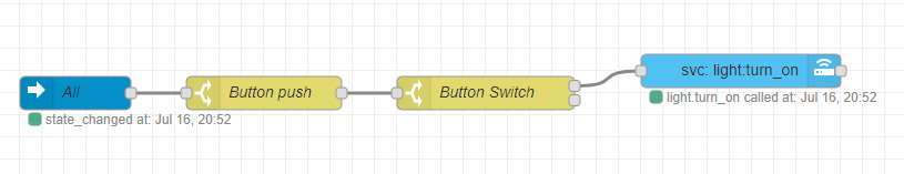 First we create the "all events" node, which ensures that everything that comes in is collected. Because we only want to use the click for the button, we provide a "switch" node where I enter the button ID to ensure that only this is passed. Then I make another switch to ensure that the single click is passed on. Finally, I turn on the lamp.