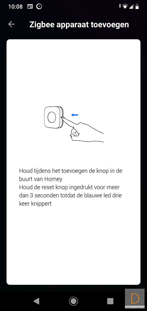 To start adding, press the button on the side for 5 seconds. The LED will flash blue. I see the sensor appear and it is registered with the push of a button. I also see the battery status. The only thing missing is the logging, I don't see my 'pressing the button' appear, while it does work with a flow.