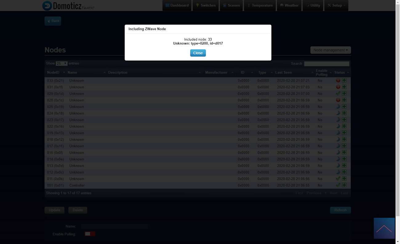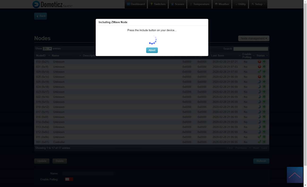 Then log in to Domoticz and go to the menu item "setup" and to "hardware". Then press the setup on the Aeon Labs controller and press include node secure. A pop-up will appear that the controller is in learning mode. Then supply the dimmer with power and press a small screwdriver 3x into the reset hole. The LED will illuminate red and then flash rapidly to indicate that the addition has been successful and that the calibration has started.
